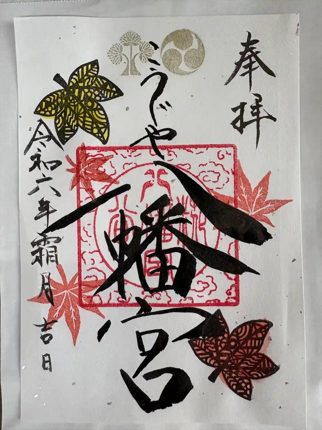 境内にあるもみじの木は、これから真っ赤に色づきます。今回の御朱印は、もみじの葉がとても繊細な透かし絵となっています。