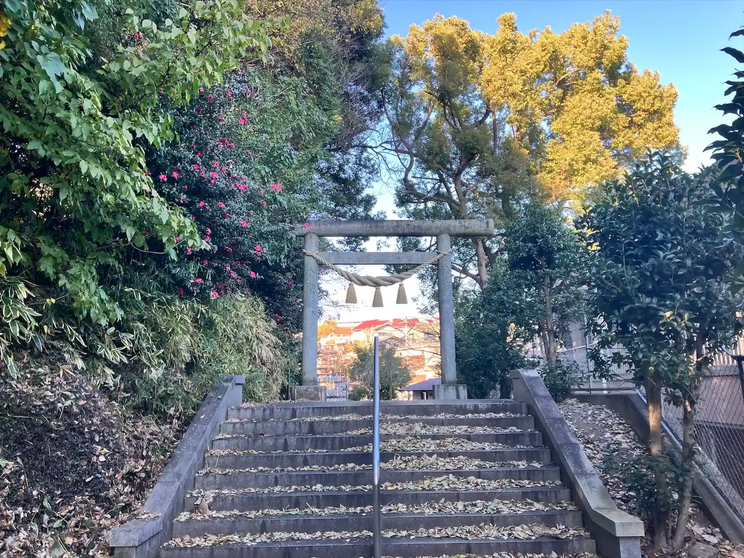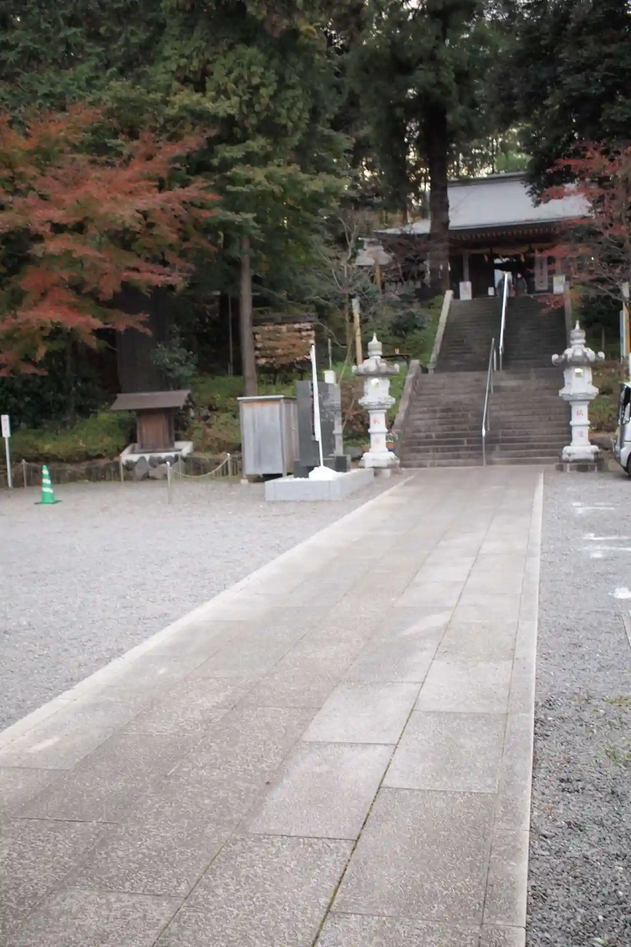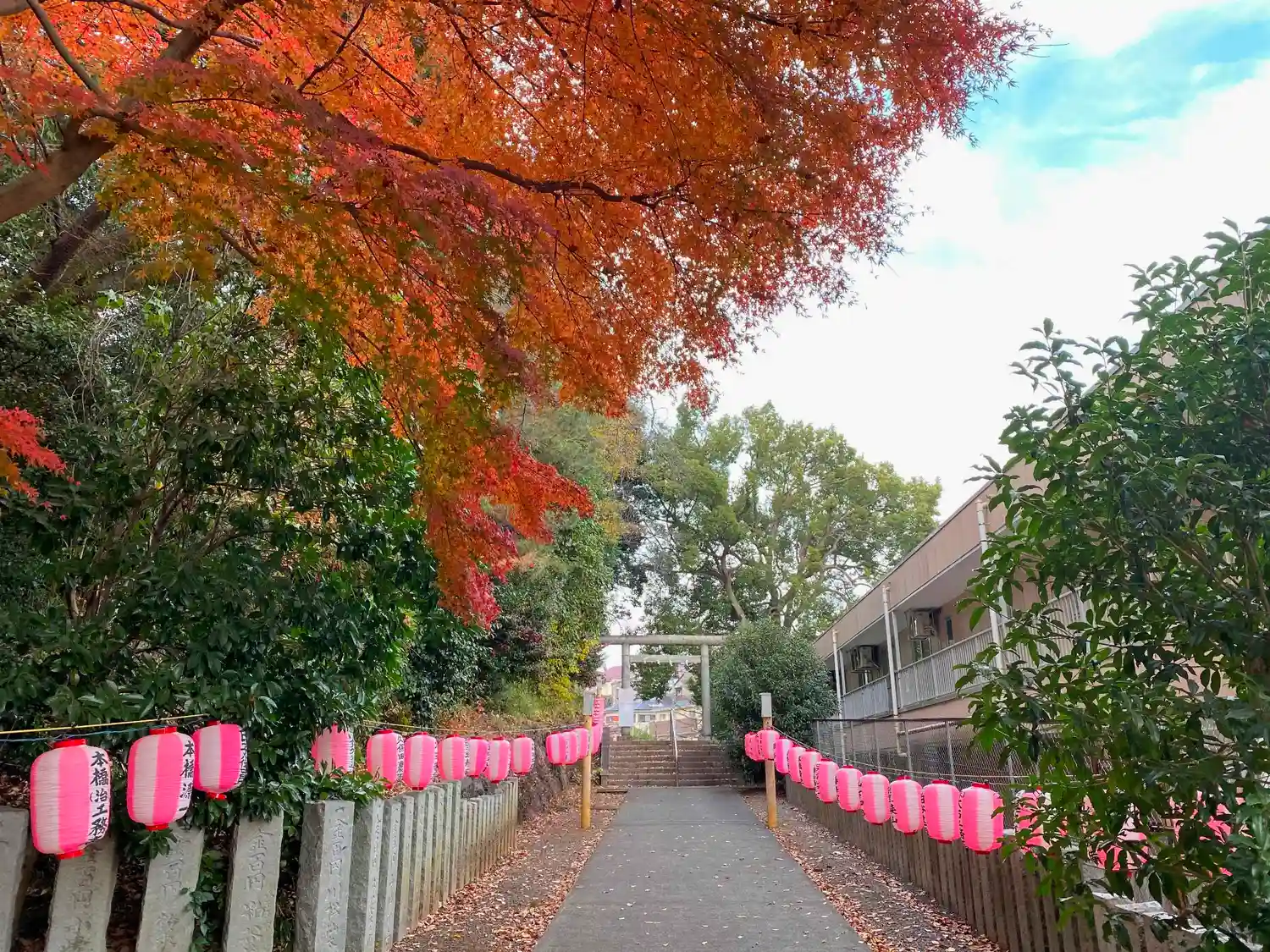 階段を登って参道を進む。紅葉がきれい。(o^―^o)