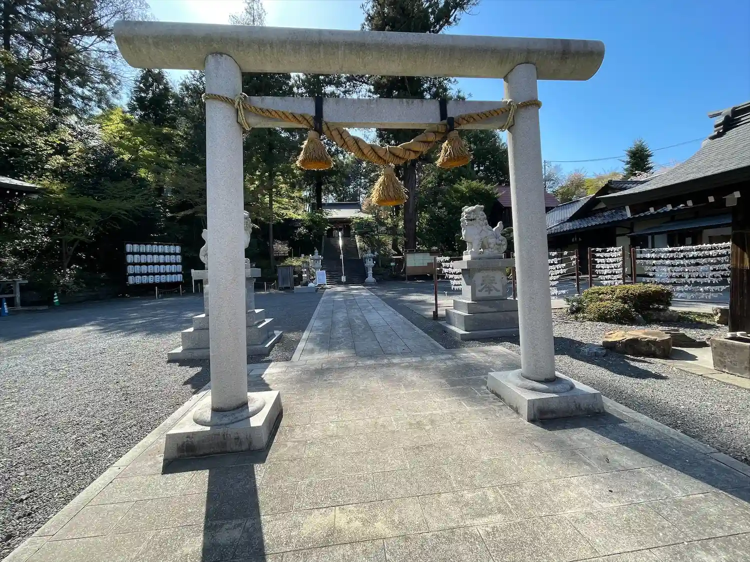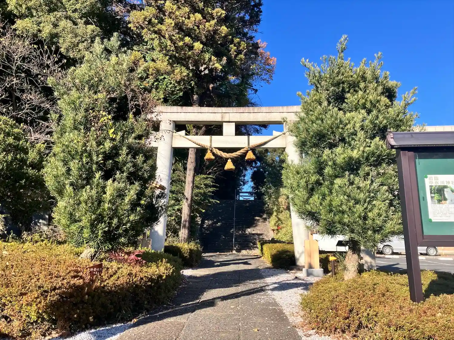鳥居右手に駐車場がありました。参道右手の道を進んで社務所前の境内にも駐車スペースがあります。