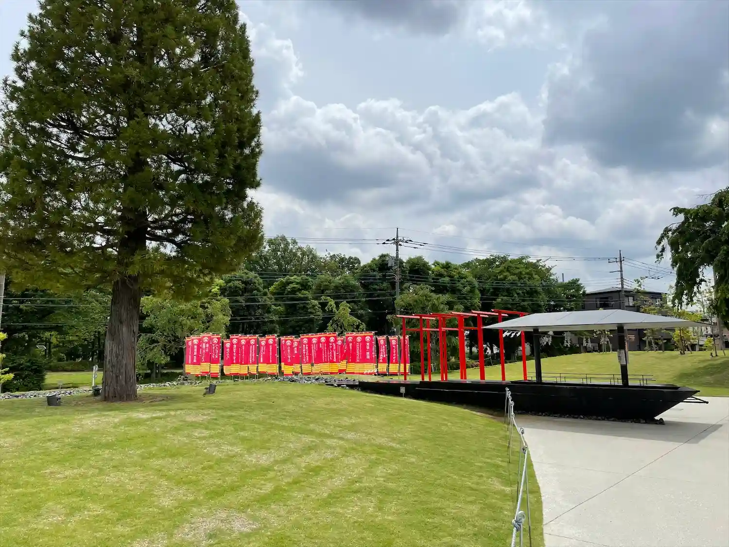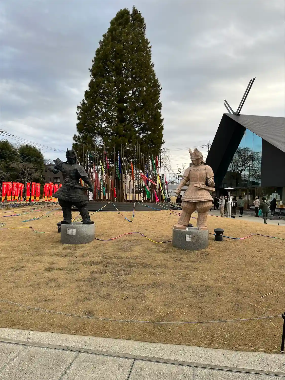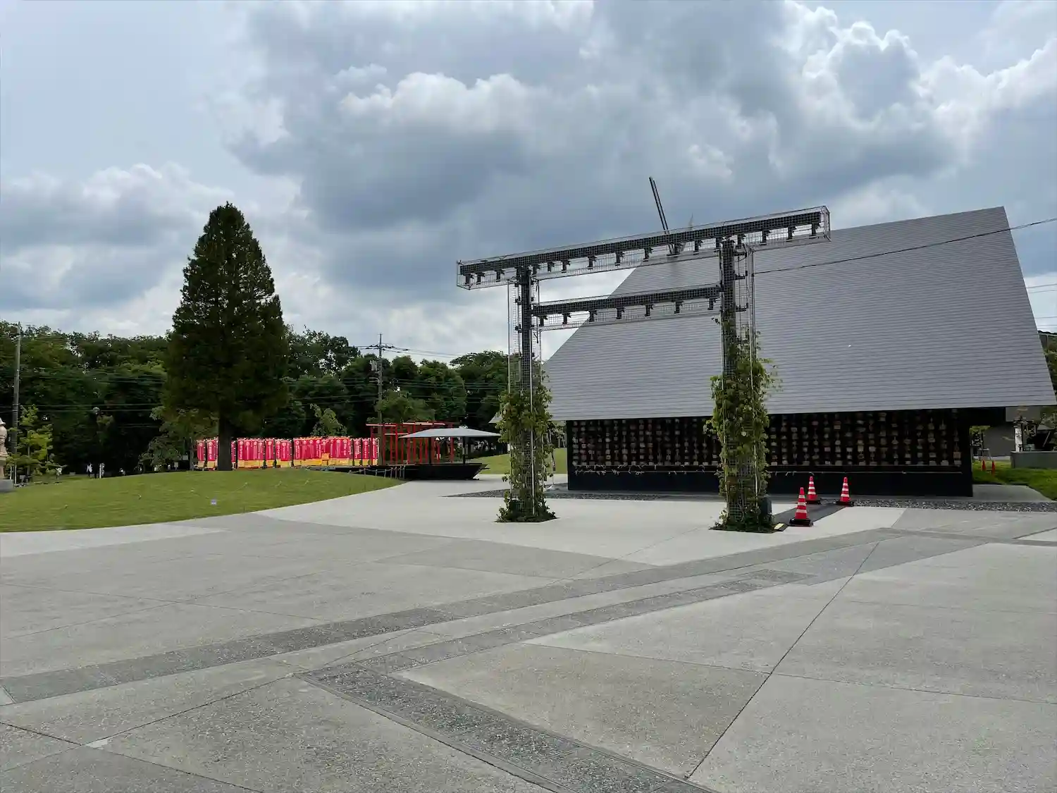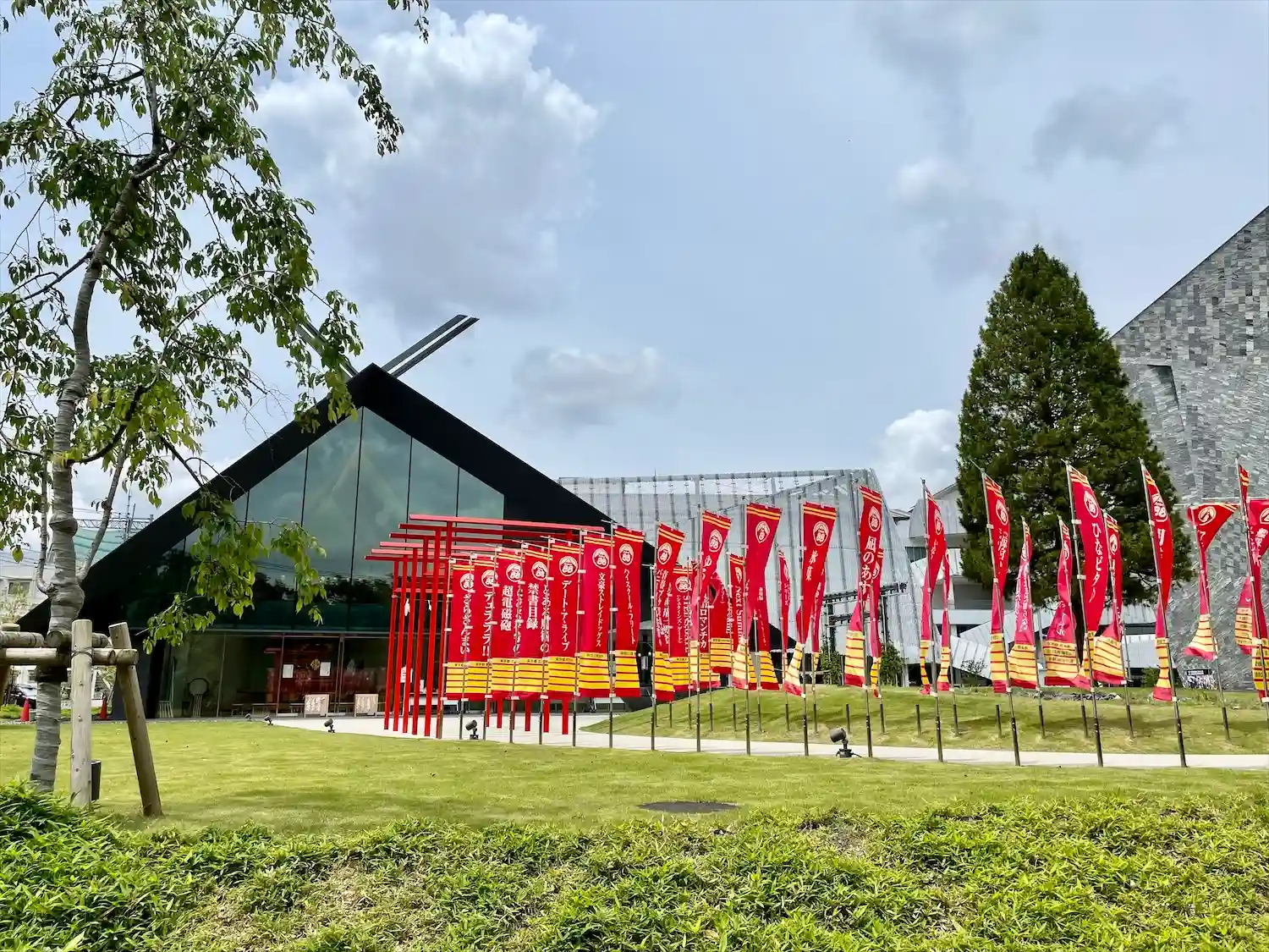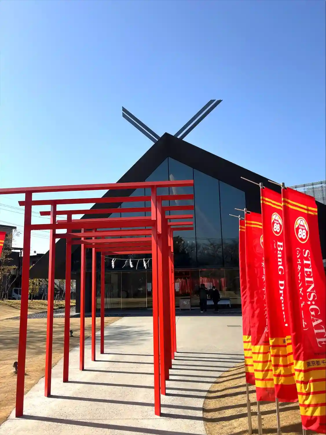 参道の幟はKADOKAWA作品がずらり。向こうに見えるのは角川武蔵野ミュージアム。大きな樹は御神木という事なのでしょうか?