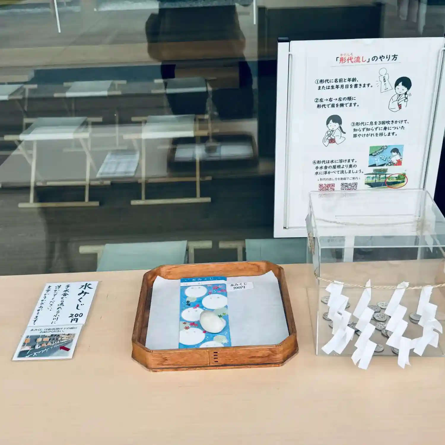 おみくじの引き方が書かれています。筒を持ち、ガラス越しに神前に向かっておみくじを引きます。