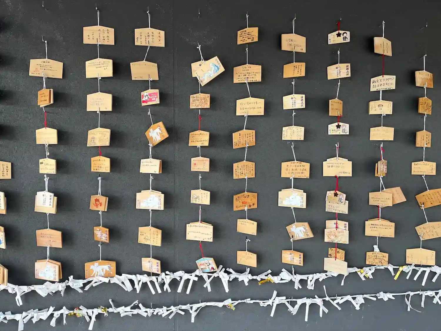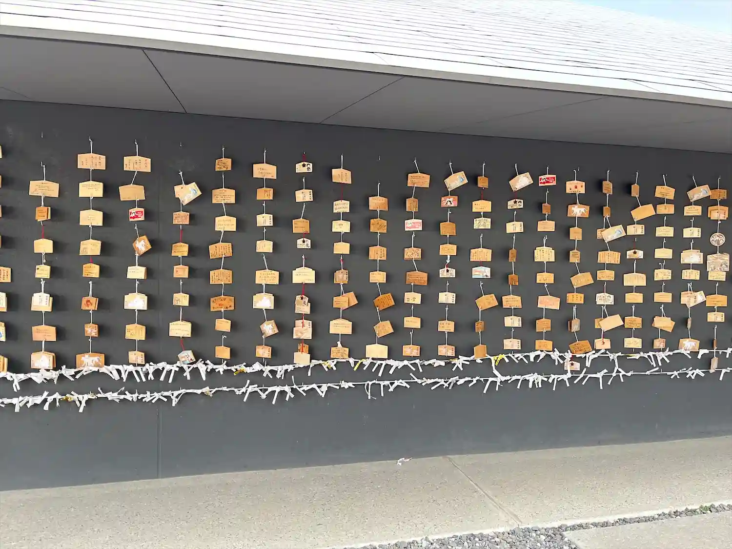 社殿の壁に絵馬を掛けます