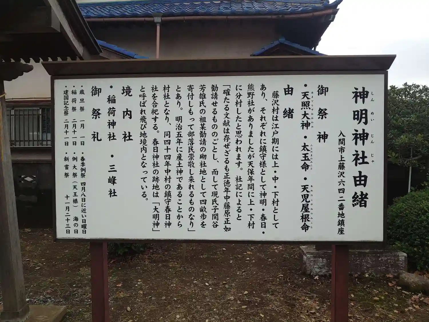 | ご由緒 | 藤沢村は江戸期には上・中・下村としてあり、それぞれに鎮守様として神明、春日、熊野社がありましたが天保年間に上・下村に分村したと思われます。社記によると「確たる文献は存ぜざるも正徳年間中藤原正如勧請せるもののごとし、而して現氏子関谷芳雄氏の祖某勧請の砌社地として四畝歩を寄付しもって部落民崇敬し来れるものなり」とあり。