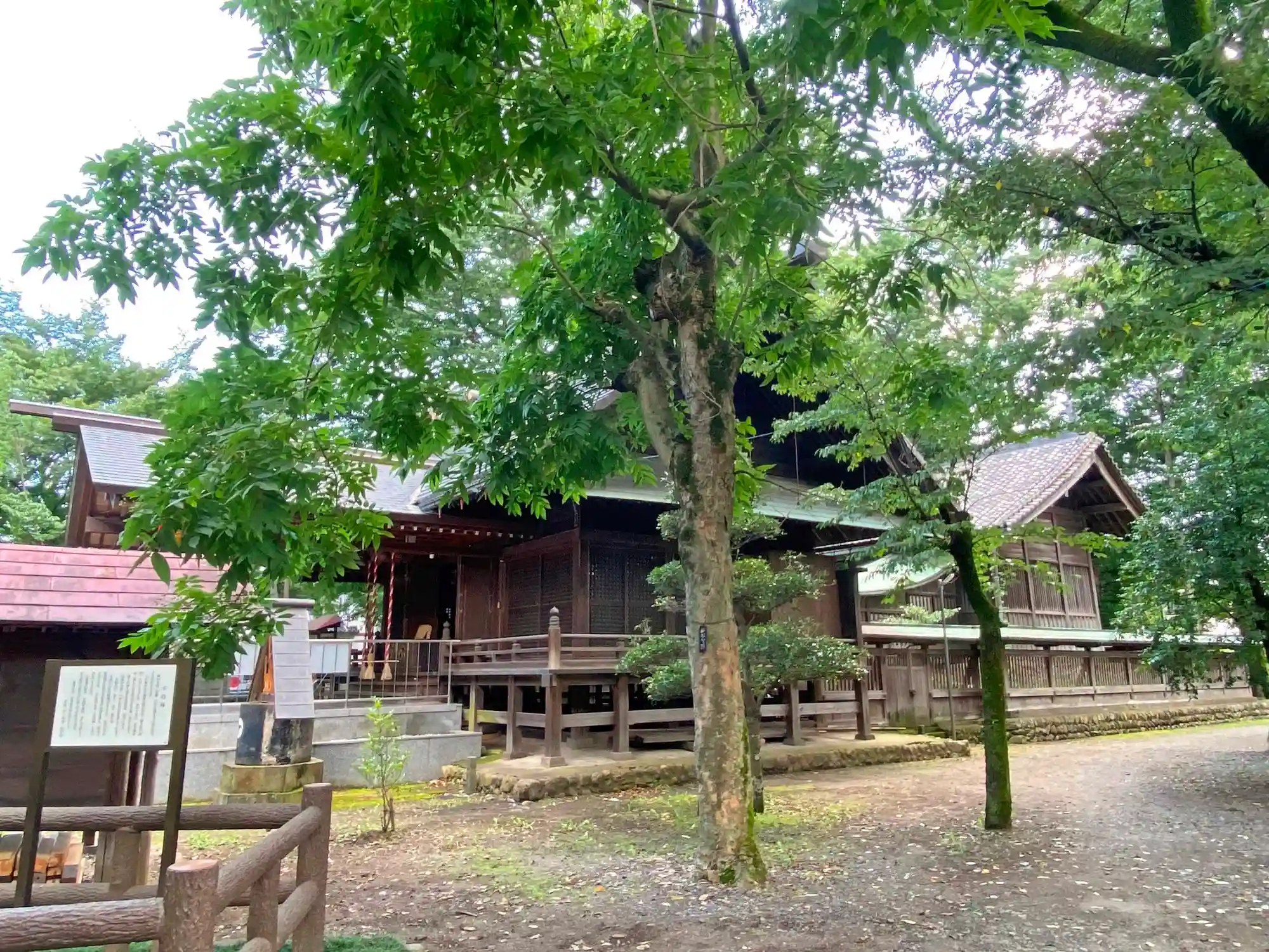 当社は、西武新宿線・狭山市駅の西方3km、西武池袋線・入間市駅の北方3kmの入間川の北側ののどかな住宅街にある。旧県社格らしく境内は広々していて、御神木の大ケヤキを中心に自然が溢れている。野鳥にとっても憩いの場となっていると思われる。