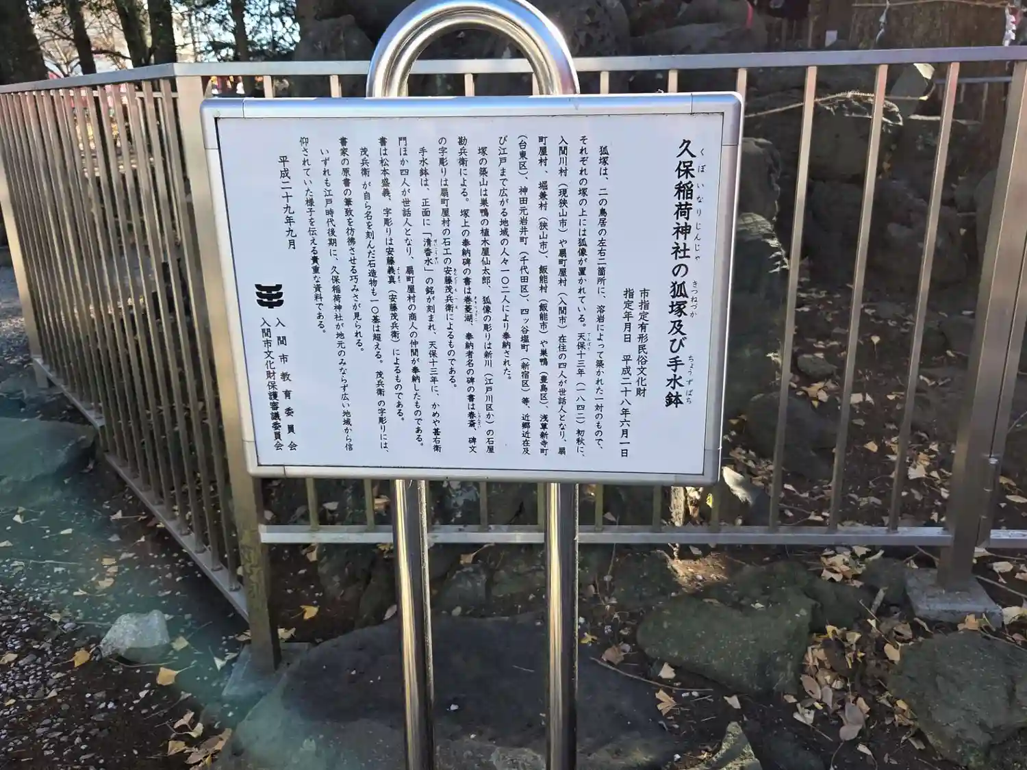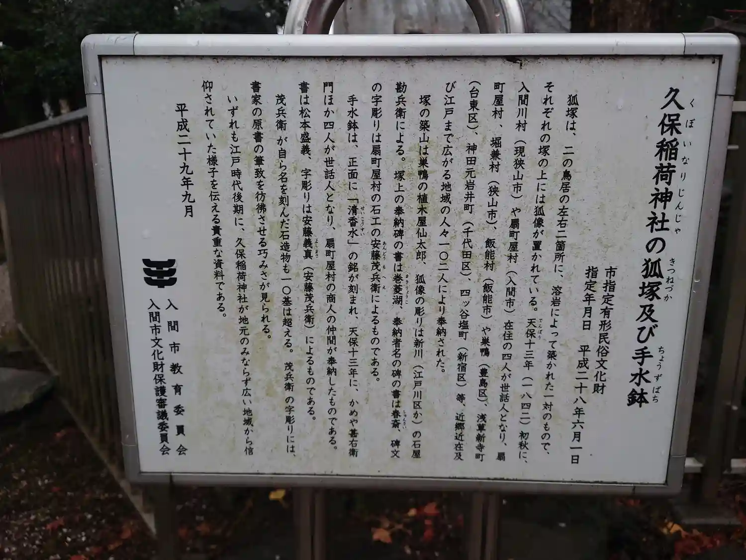 「狐塚および手水鉢」の説明版