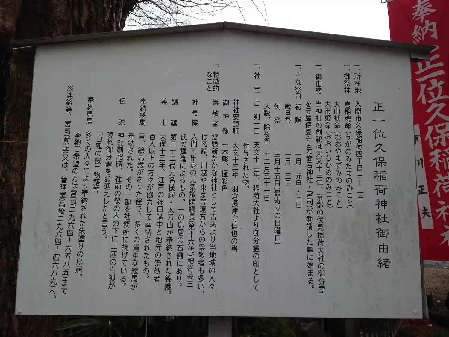久保稲荷神社は、天文13年(1540)京都の伏見稲荷大社の御分霊を守屋伊豆守(元愛宕神社宮司)が勧…