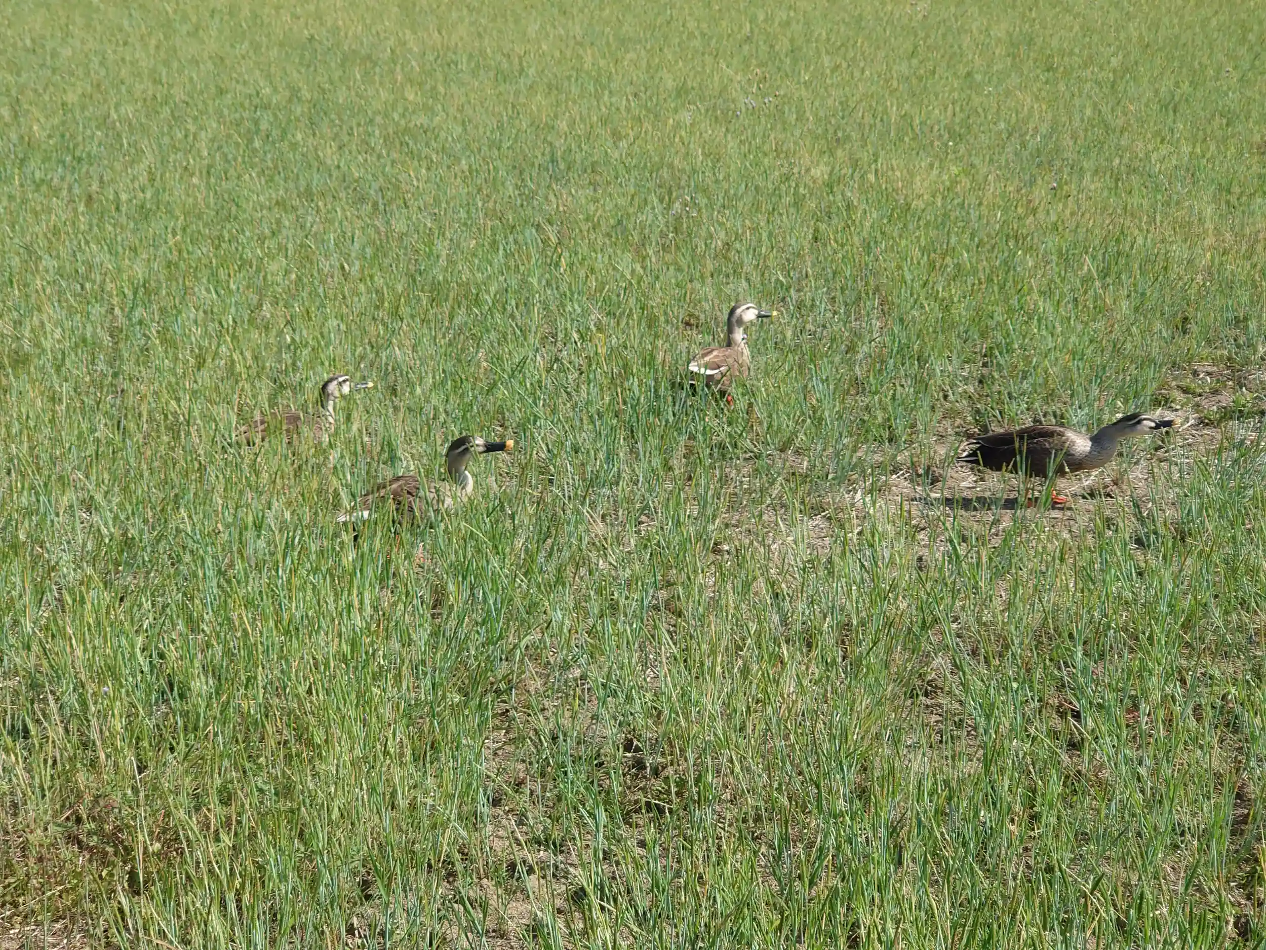 なんか鳴き声がするなと思ったら、近くでカルガモさん一家がお食事中でした
