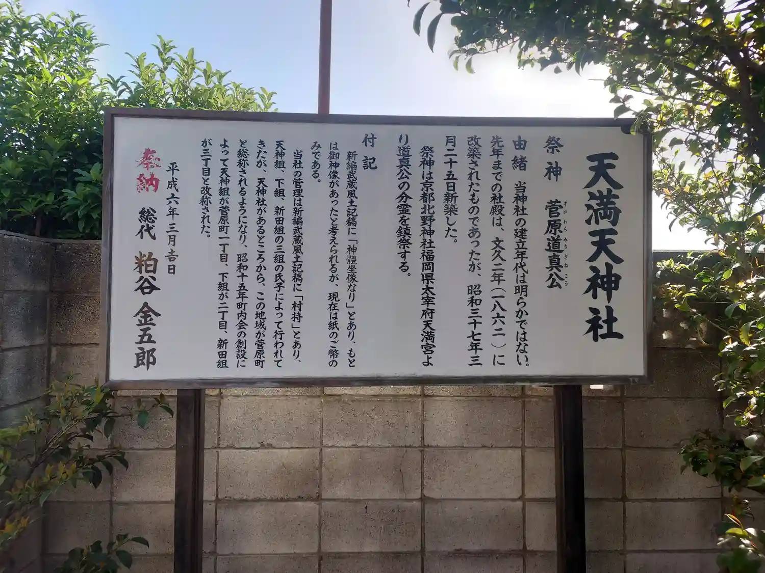 創建年代は不明です。京都北野神社福岡県太宰府天満宮より道真公の分霊を鎮祭しています。