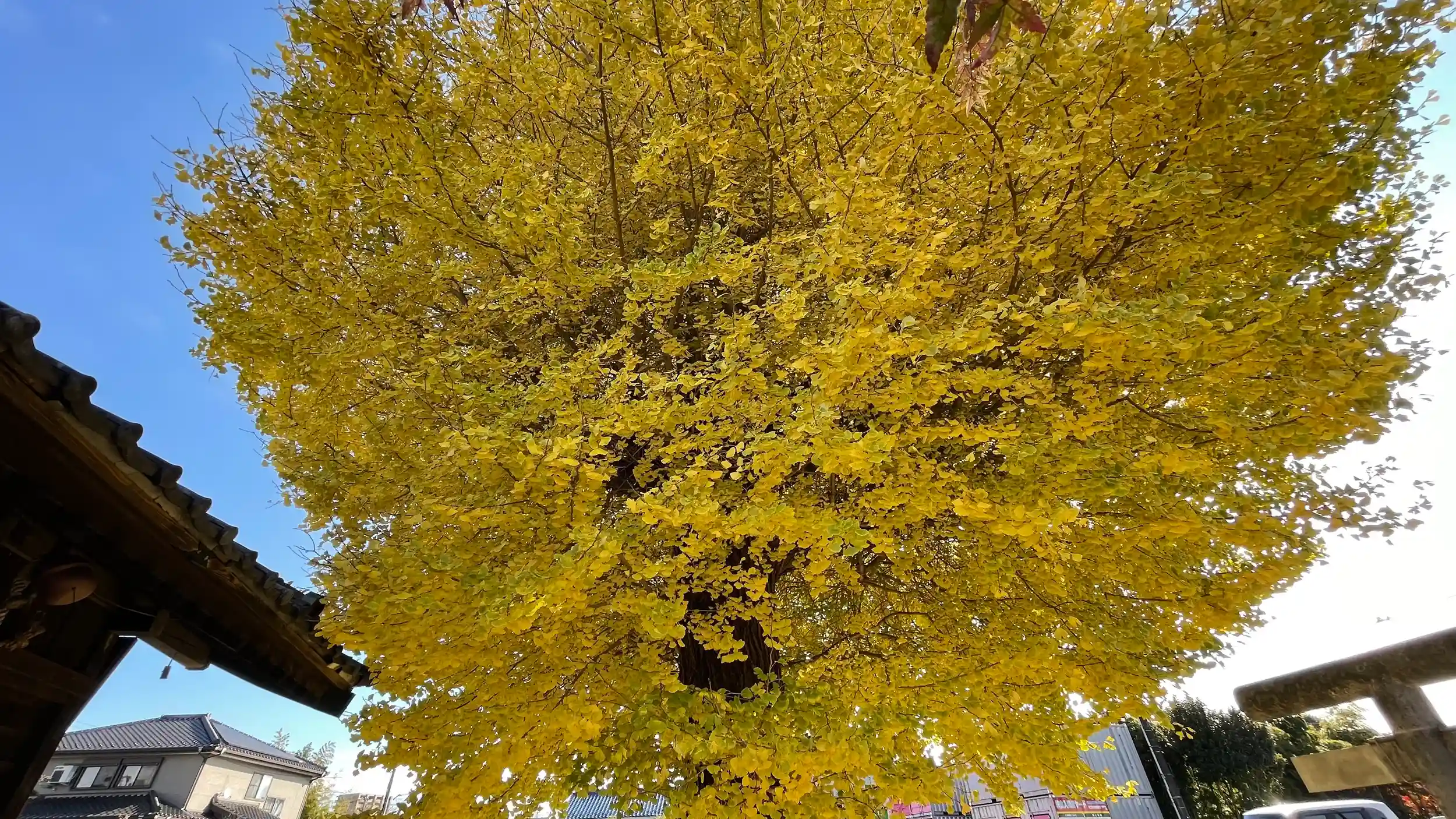 R16沿い。小さく目立たない神社だが国道沿いに大きな銀杏が見える。