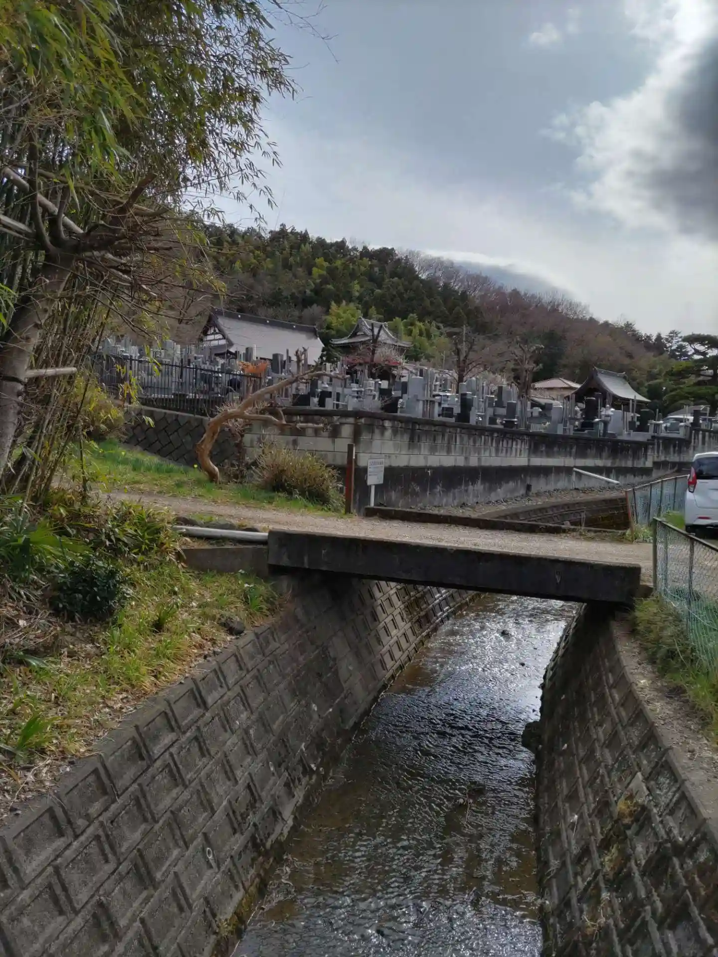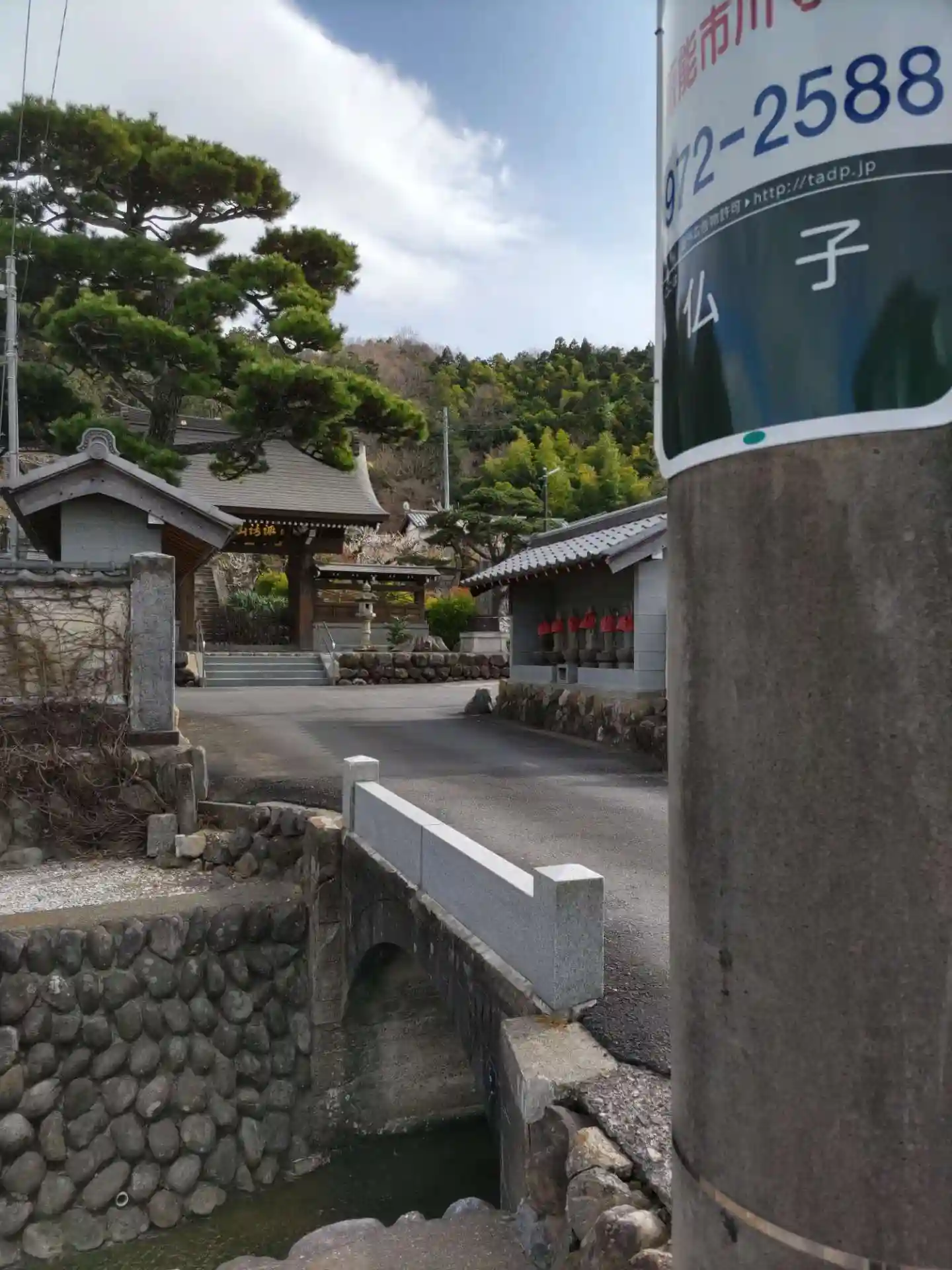 お寺の前は川