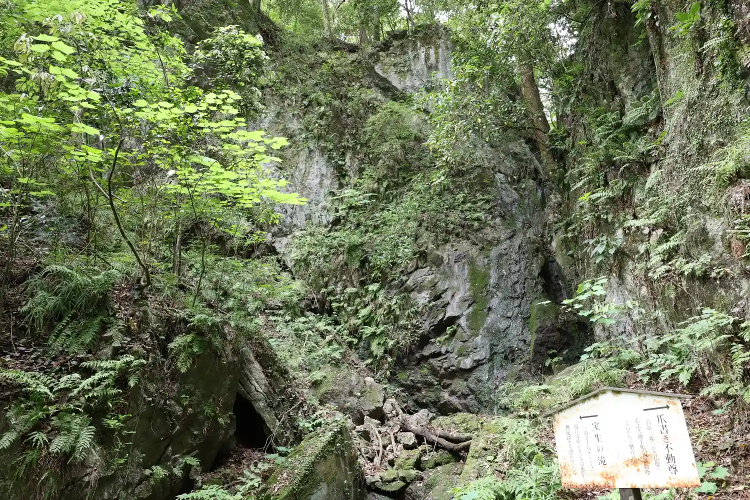 道の突き当たり左手に宝生の滝(高さ18m)、右手に弘法の爪書き不動(岡部六弥太公無念の不動とも言われる磨崖仏)があります。かなりのパワーを感じます😊✨