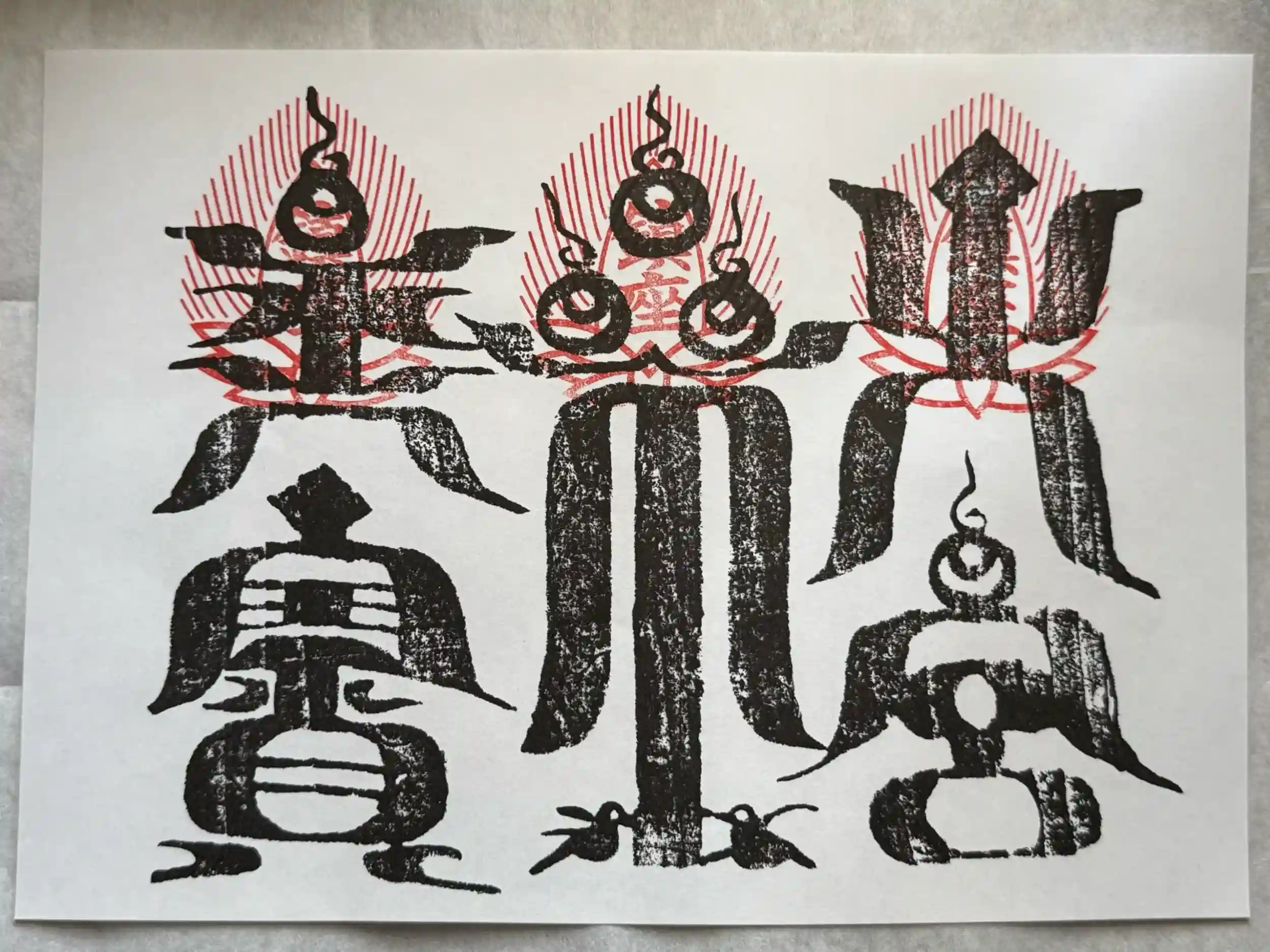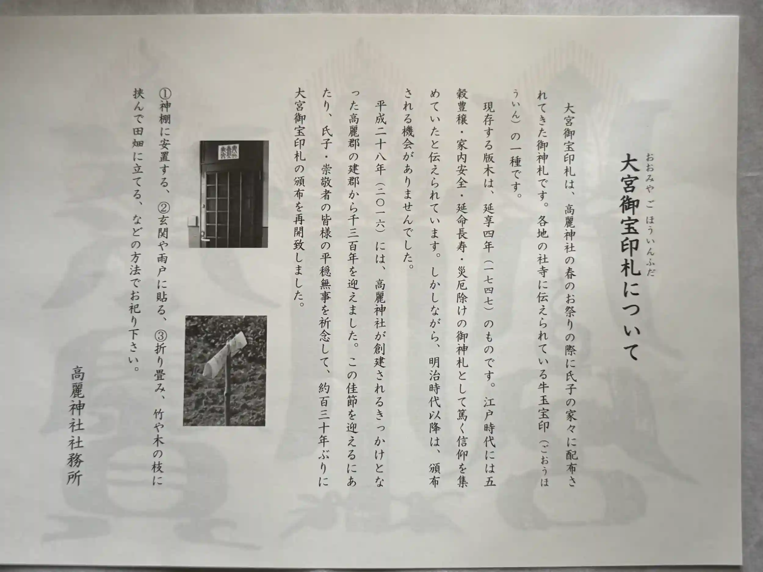 高麗神社の春のお祭りの際に氏子の家々に配布されてきた御神札です。これは各地の社寺に伝えられている牛玉宝印(ごおうほういん)の一種で、江戸時代から五穀豊穣・家内安全・延命長寿・災厄除けなどの御神札として篤く信仰を集めてきました。今日では、氏子に限らず、崇敬者の方にもお分けしています。