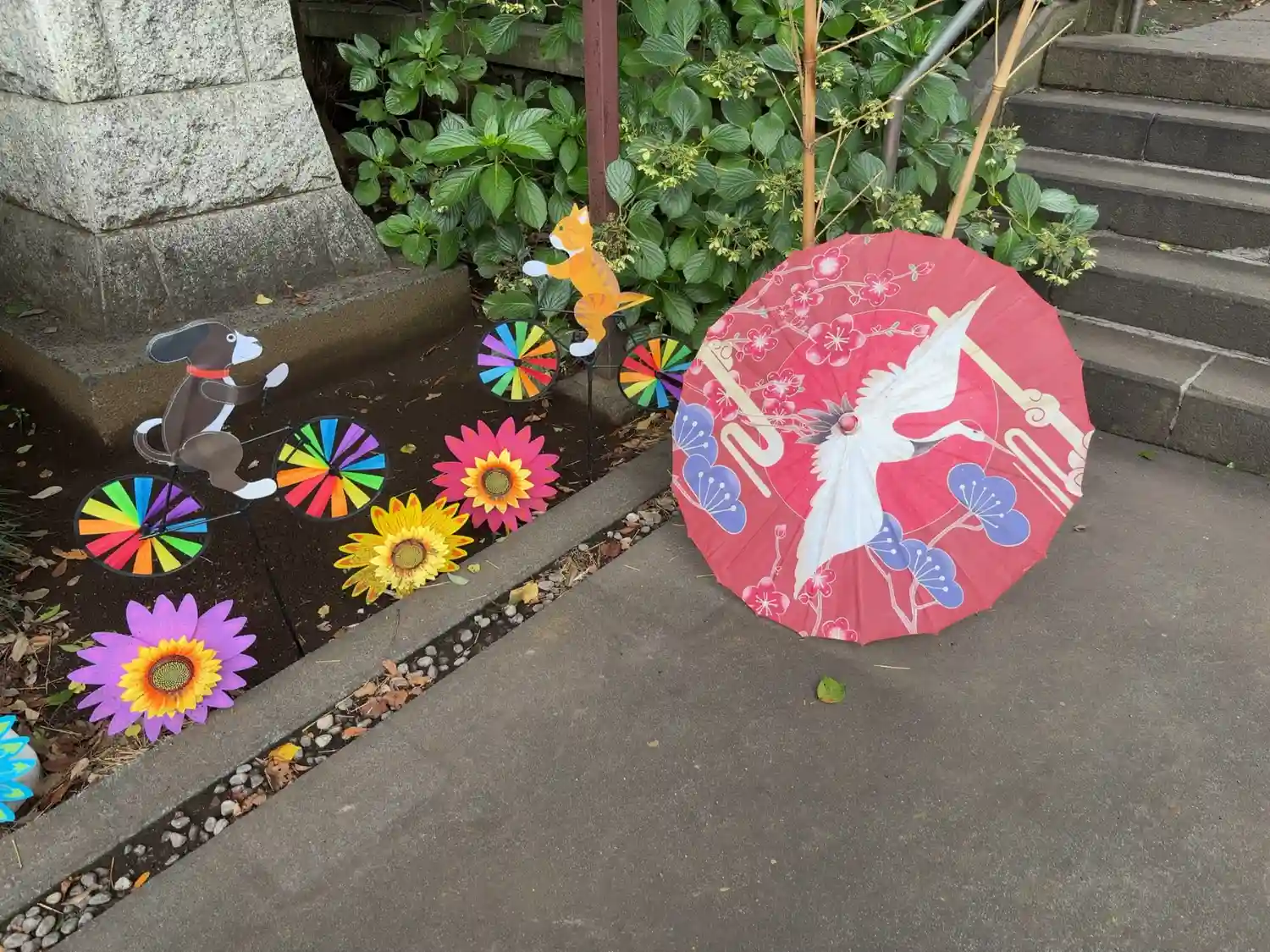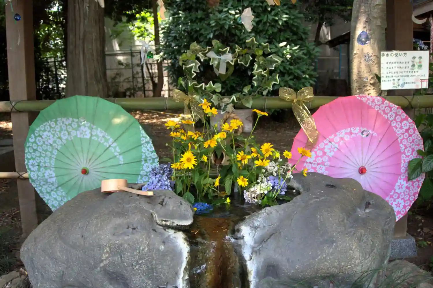番傘も装飾された花手水