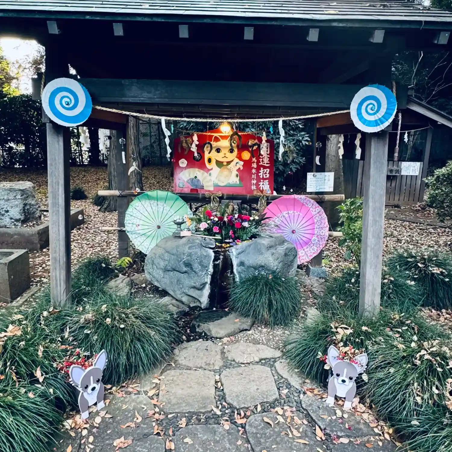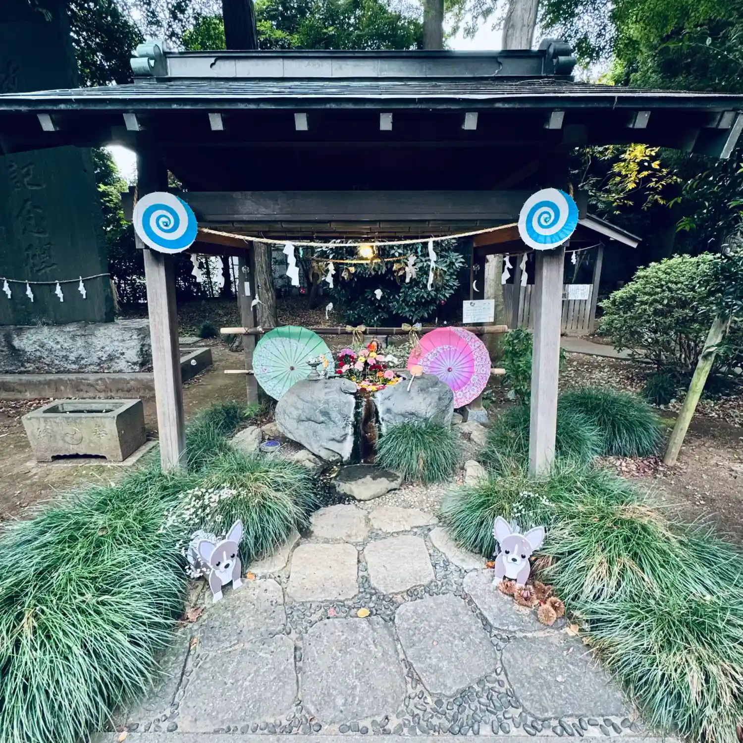 花手水の両サイドに子犬がいて可愛いですね!