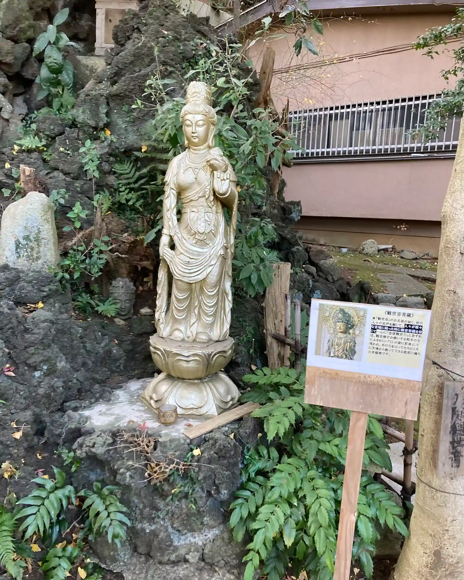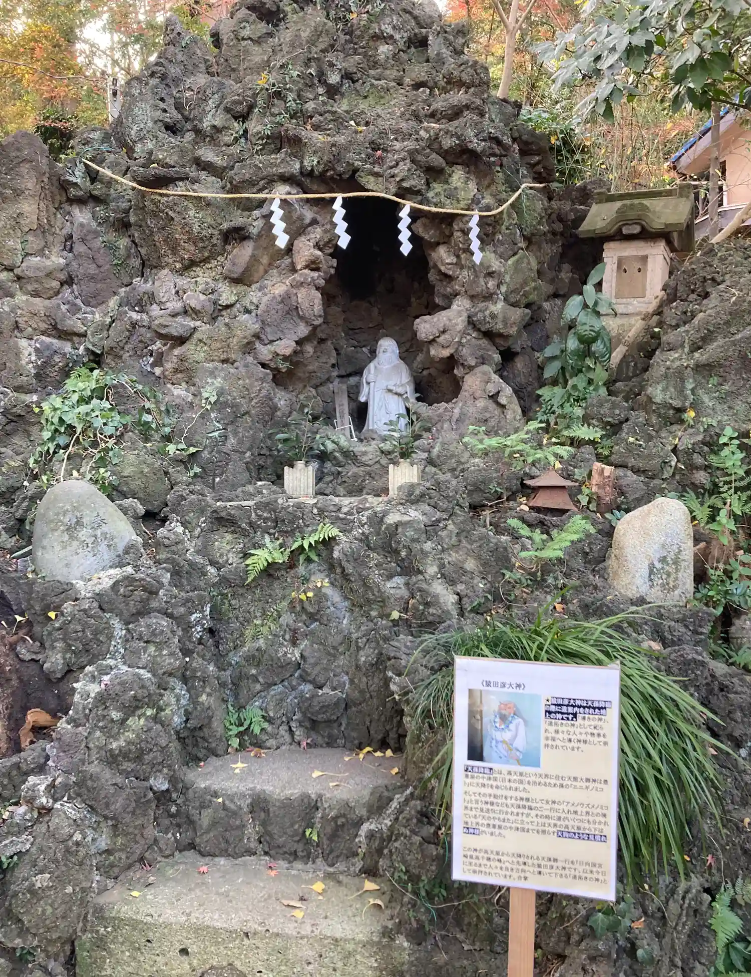 境内には富士山の溶岩を運び、3年掛けて作られた「開運洞窟」があり、東京近郊ではめずらしい洞窟めぐりができます。参道石段を上がると左手に洞窟があり、 中を一回りできます。 入り口の扉を開けて、電灯のスイッチがあります。洞窟を出たら電灯のスイッチを必ず切りましょう。