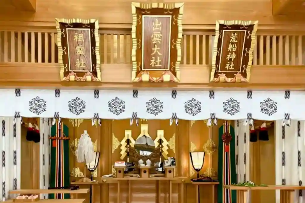 拝殿内、右から荒波神社さん、中央出雲大社さん、左側祖霊社さん🙏