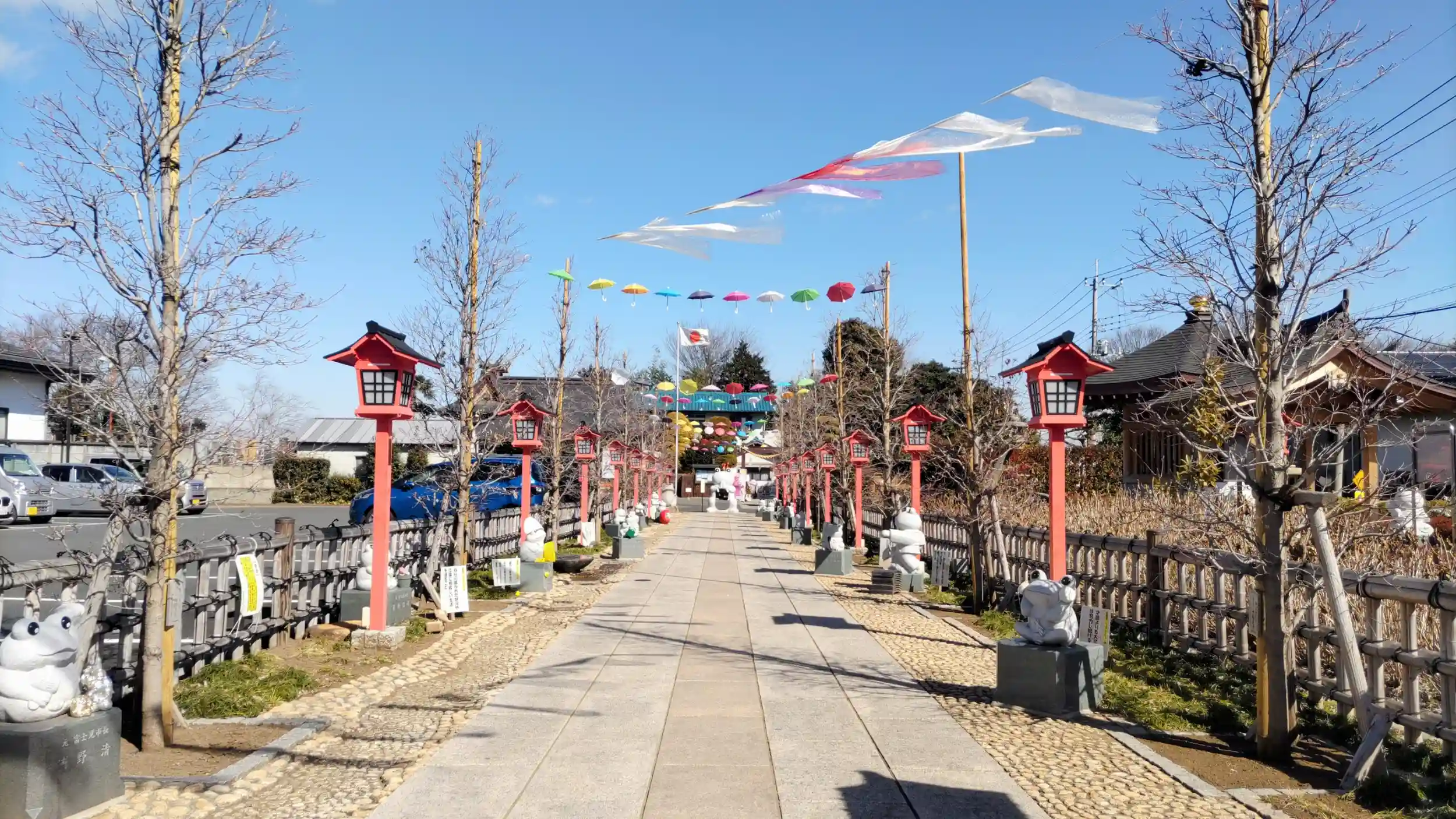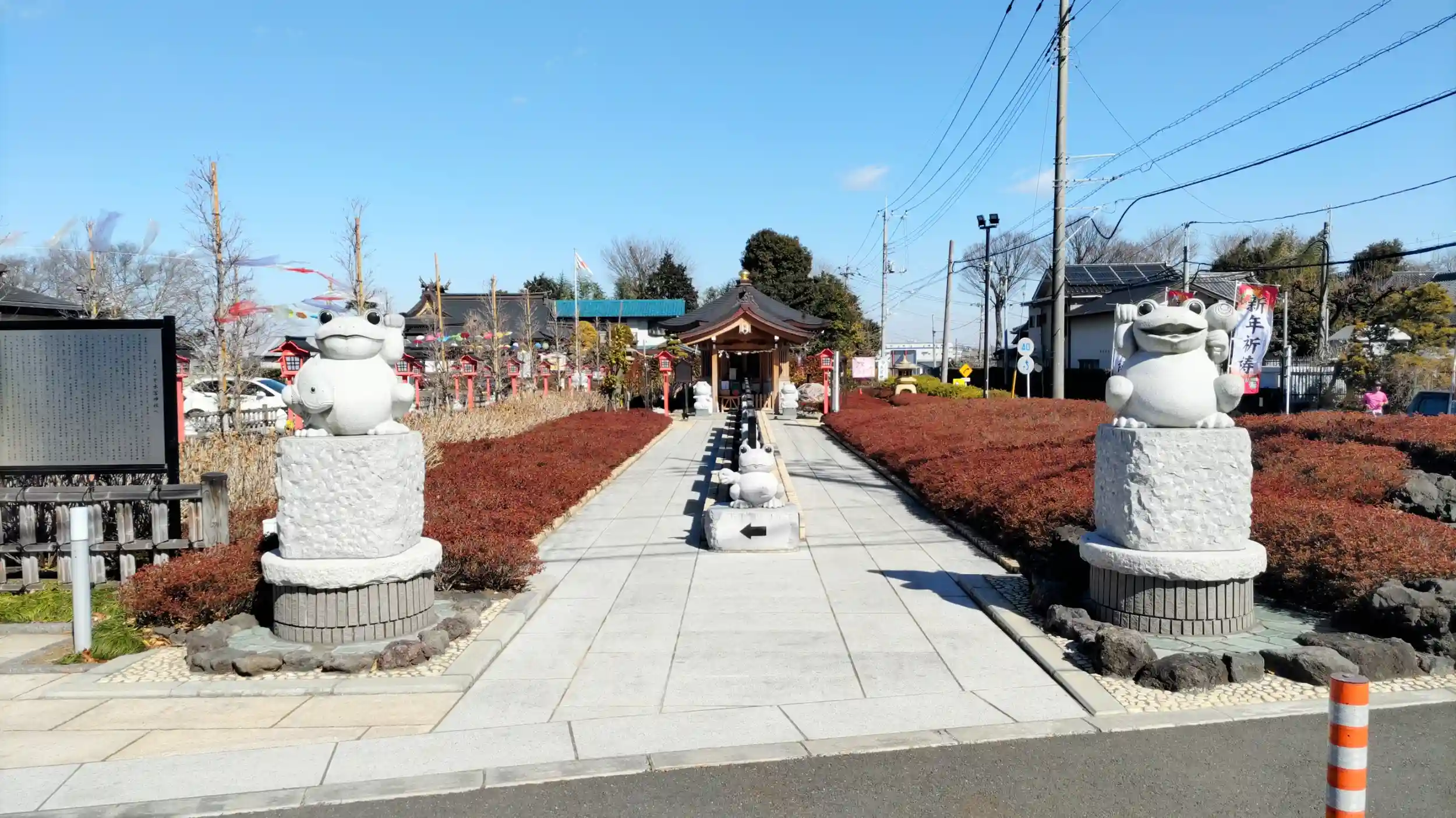 カエルの沢山いる参道の左手が駐車場になっています。