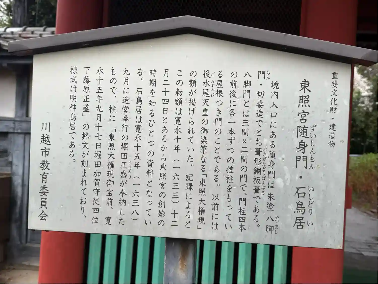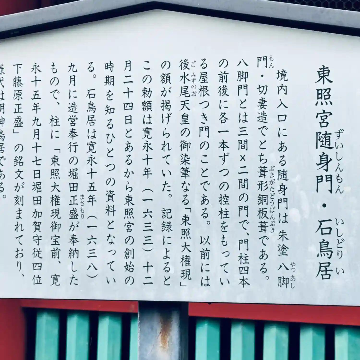 日光へ改葬し東照宮を創建したあとに後水尾天皇さまから勅額を賜って創建しているのですが、そのスピードが半端なく、日光東照宮と同年内に建てられています。