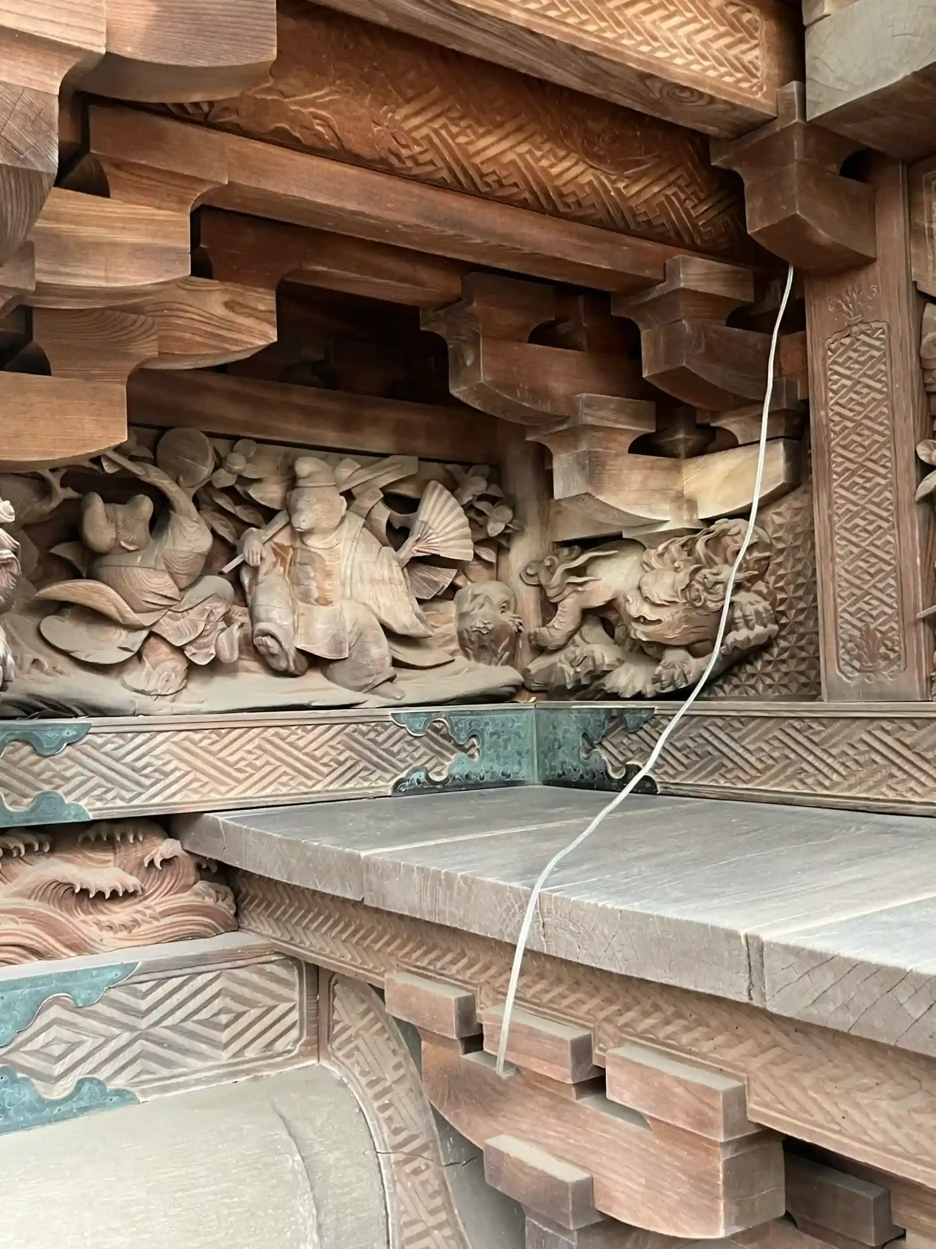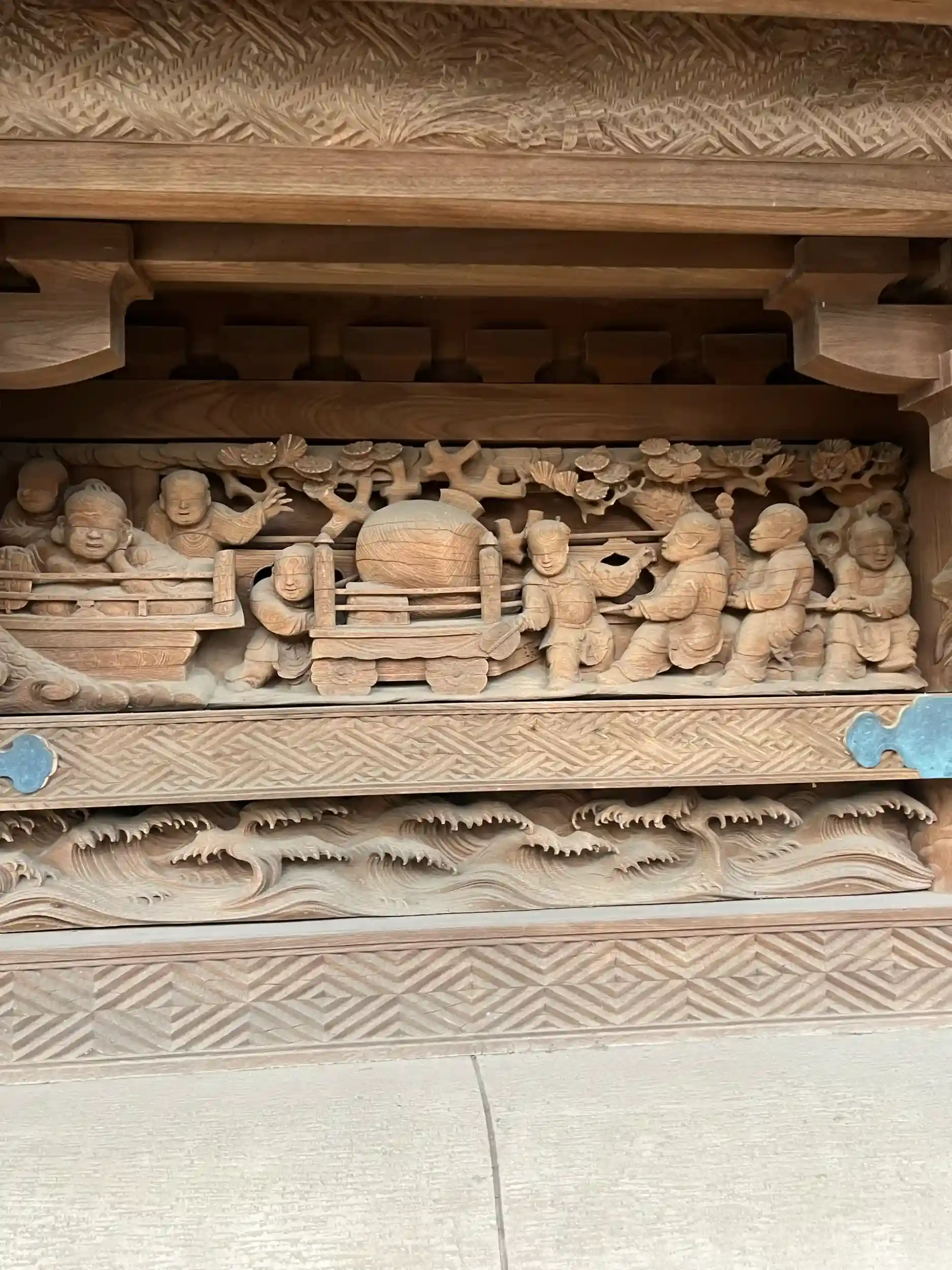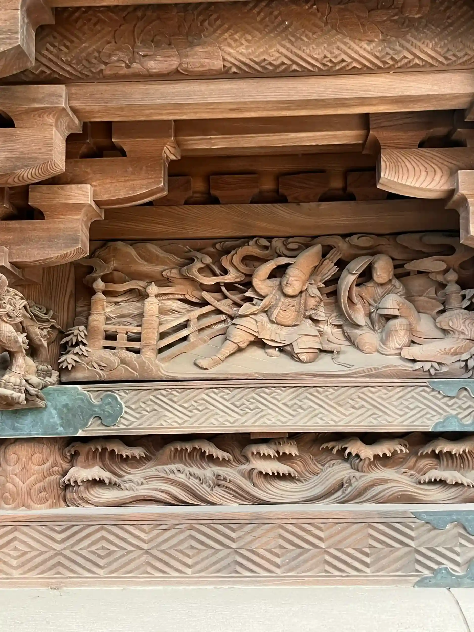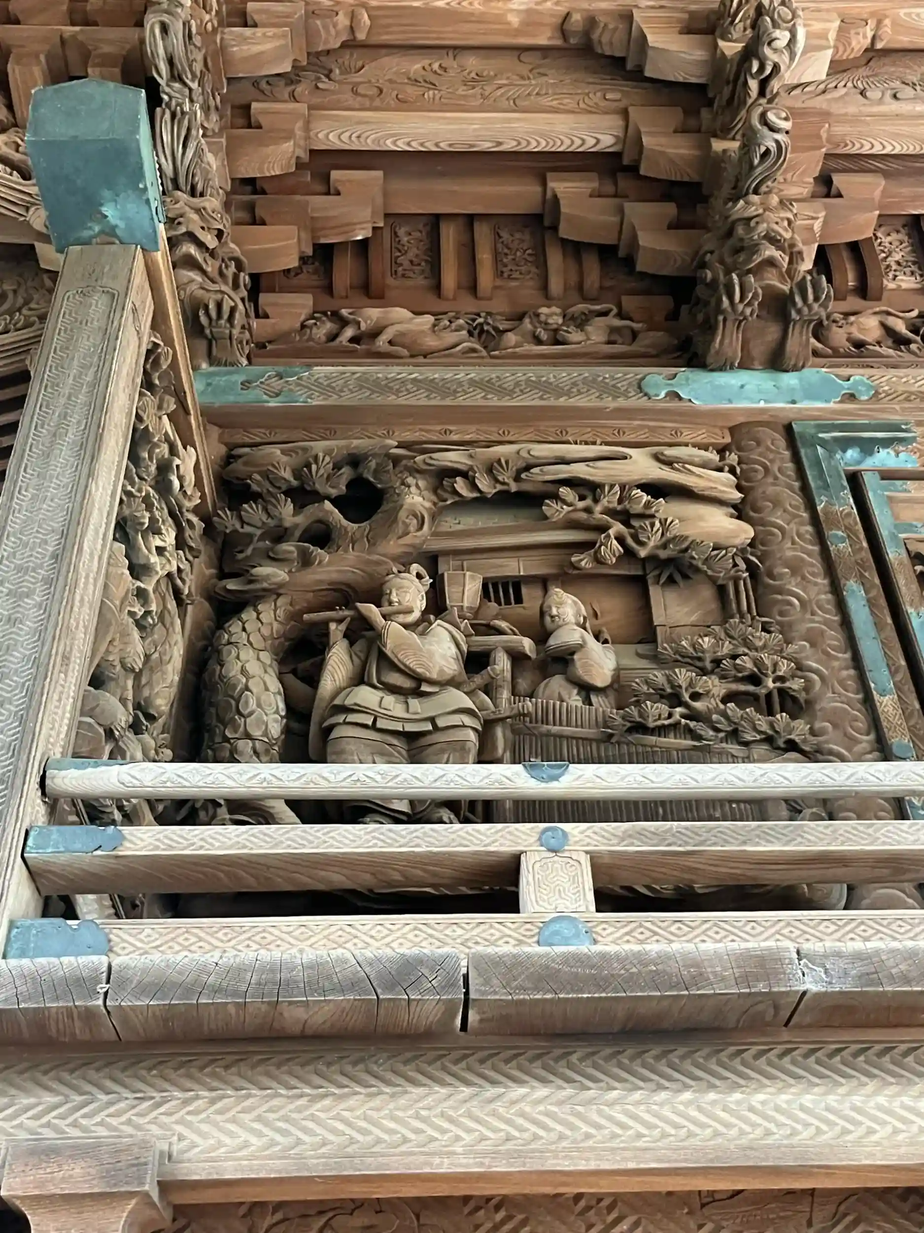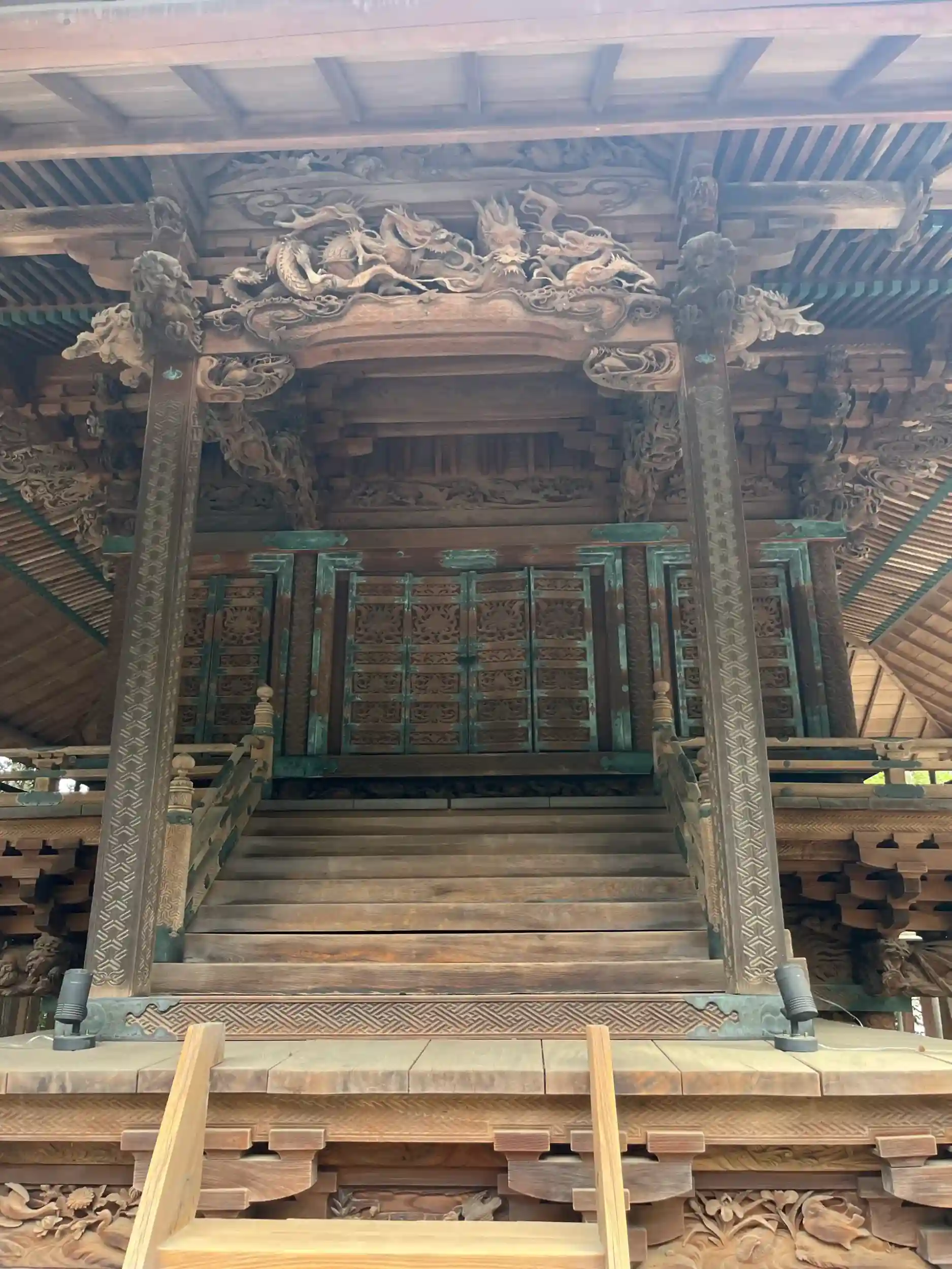 川越氷川神社の本殿。宮司に拝観させていただきました。物語調の木彫りが圧巻。木目までを計算に入れた彫刻が見事。いつまでもみていられるご本殿でした。