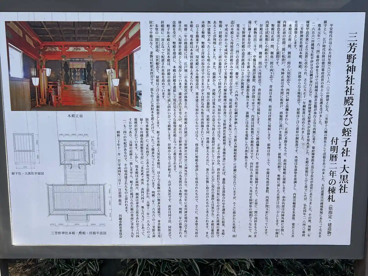 現存の社殿は、寛永元年(1624年)に川越城主酒井忠勝が三代将軍家光の命を受けて造営。