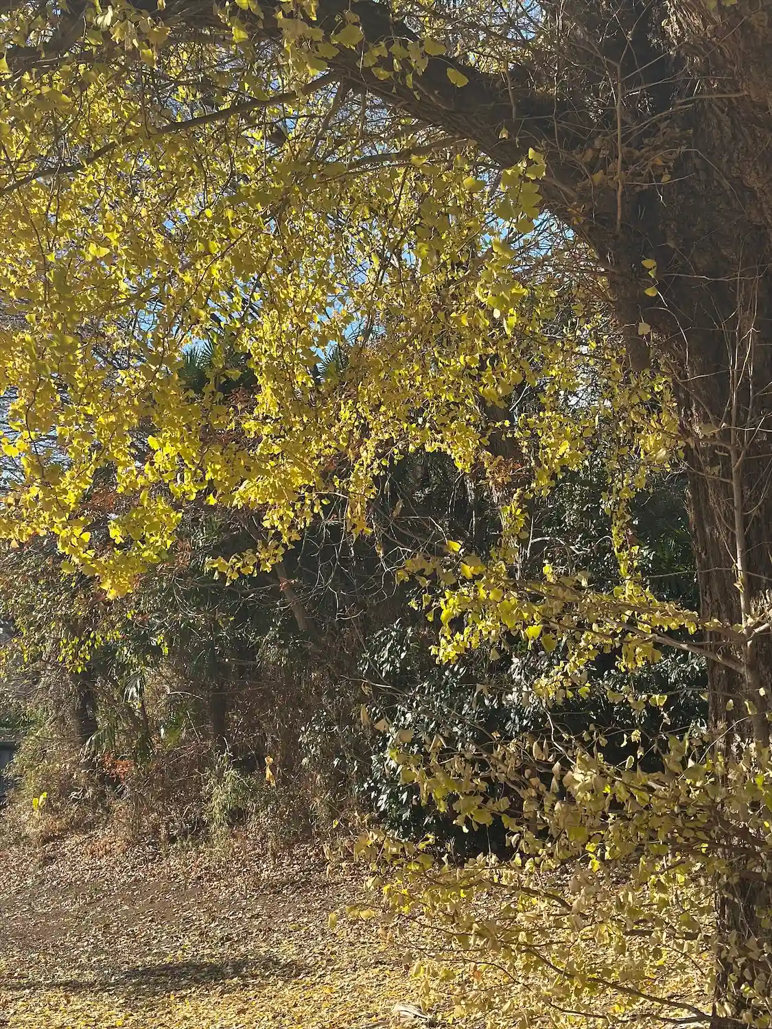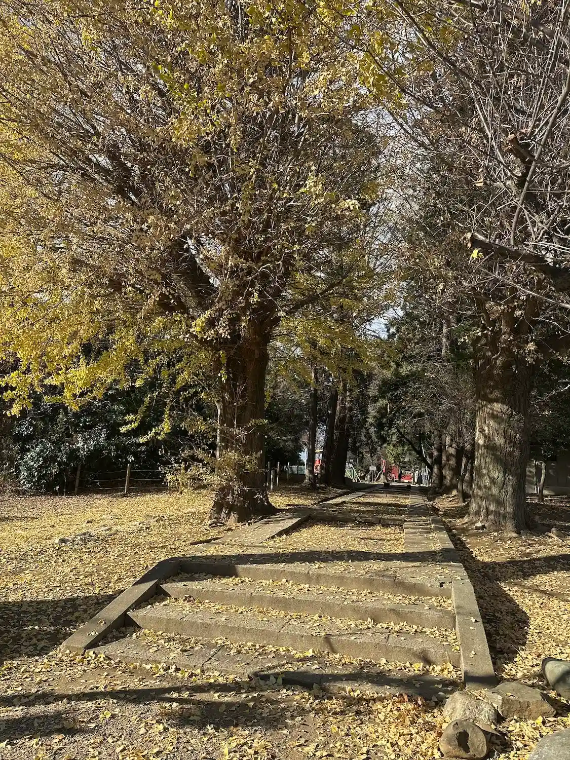 銀杏が綺麗な参道。奥に小さく赤く見えるのが拝殿