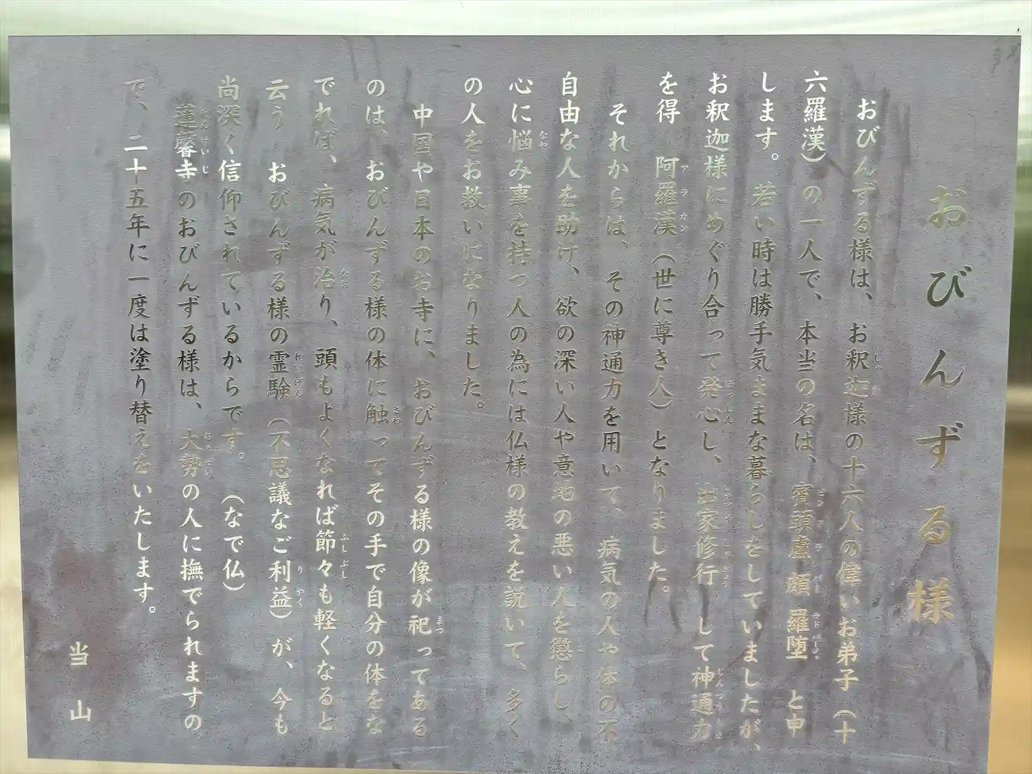 力強い直書き。おびんずるさまには外国人観光客多く触れず
