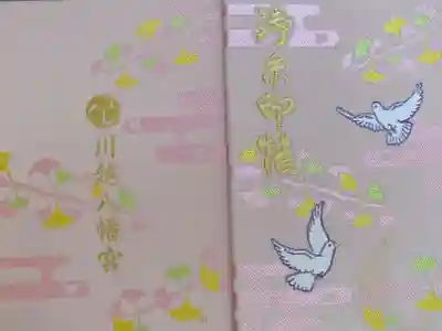 中央に神社印、右上に「奉拝」の文字と鳩の印があり、印の色と鳩の身体の月名、くわえているイチョウの葉の中の文字が毎月変わります。鳩は川越八幡宮の神使で、境内には「縁結びイチョウ」と呼ばれる御神木があります。