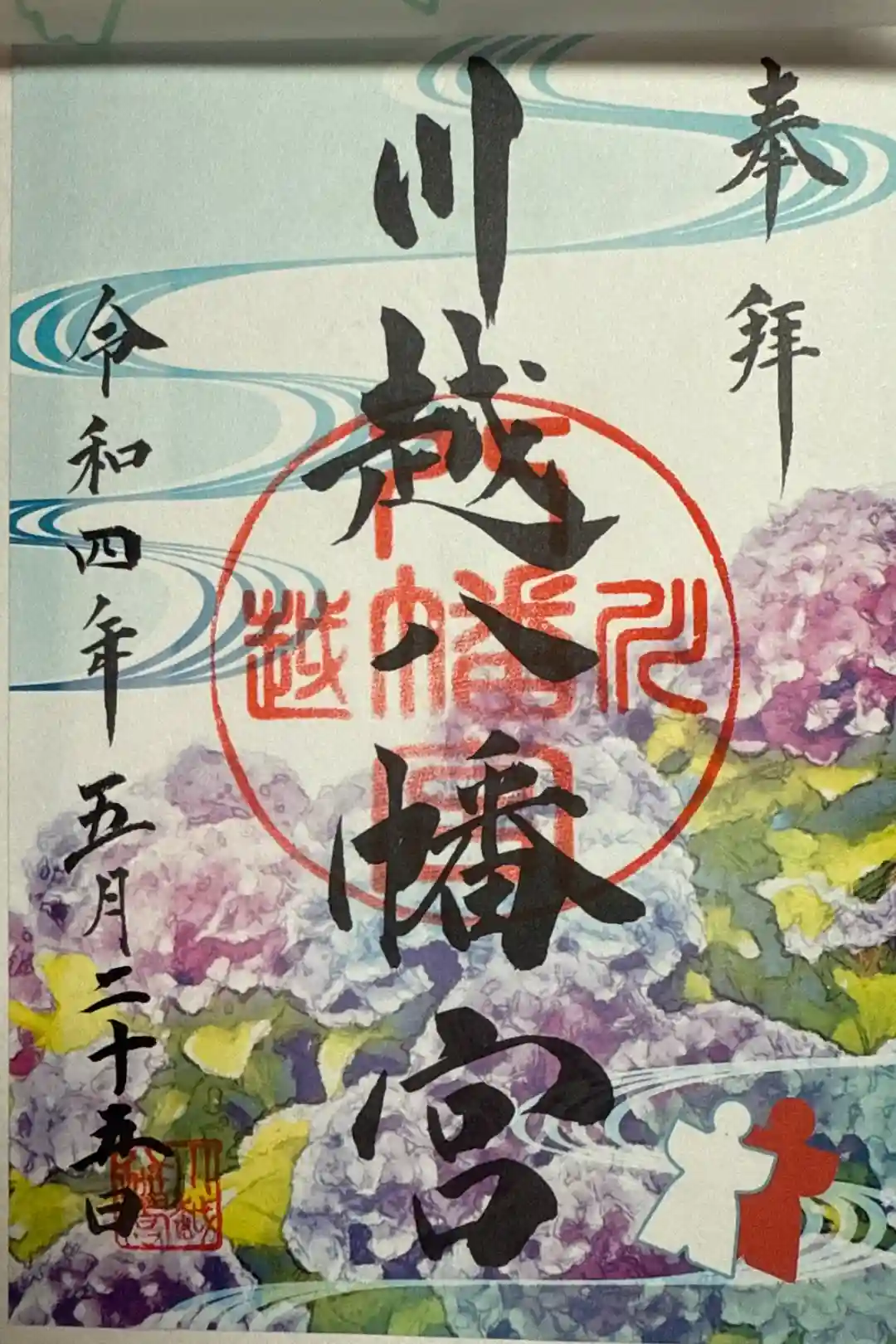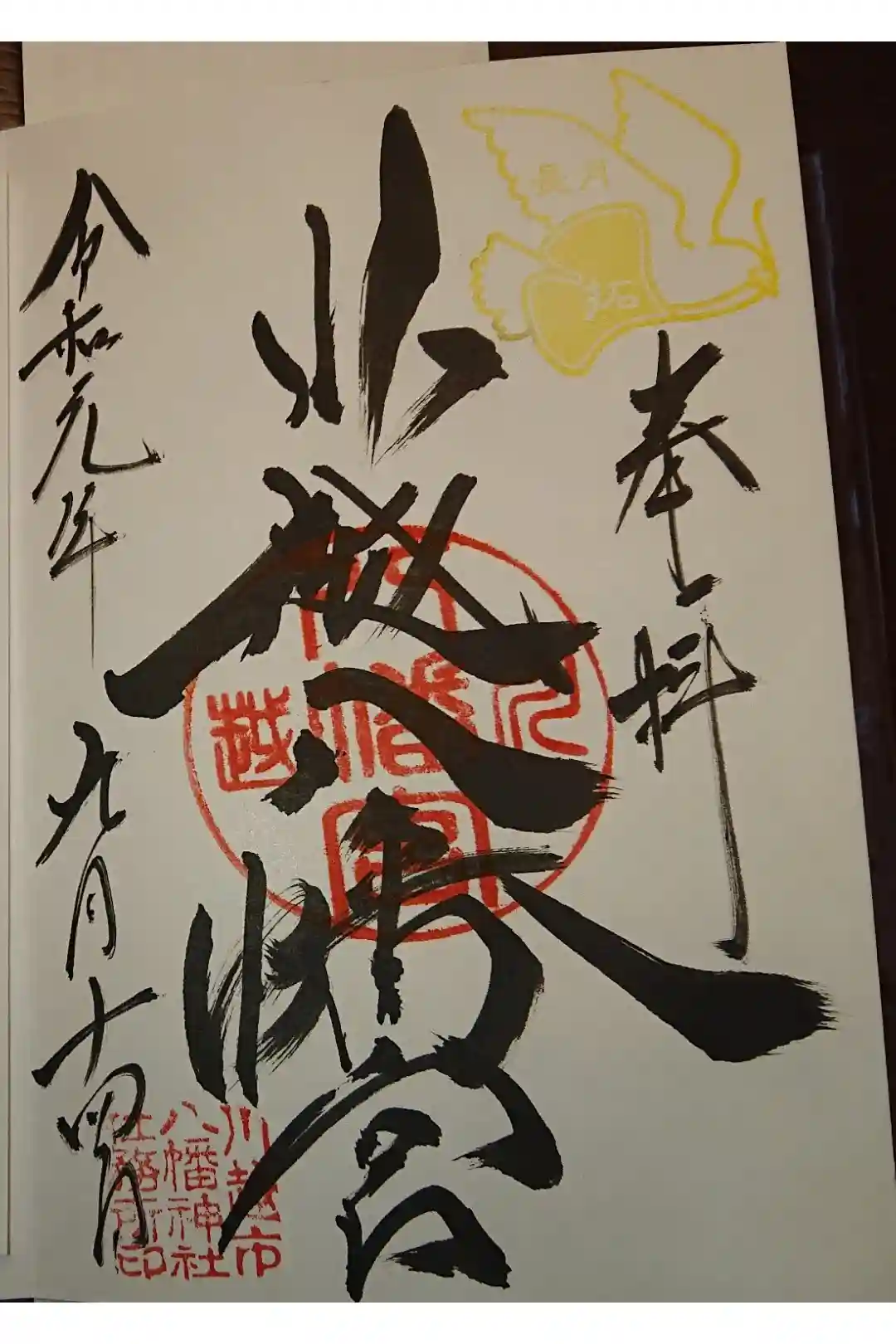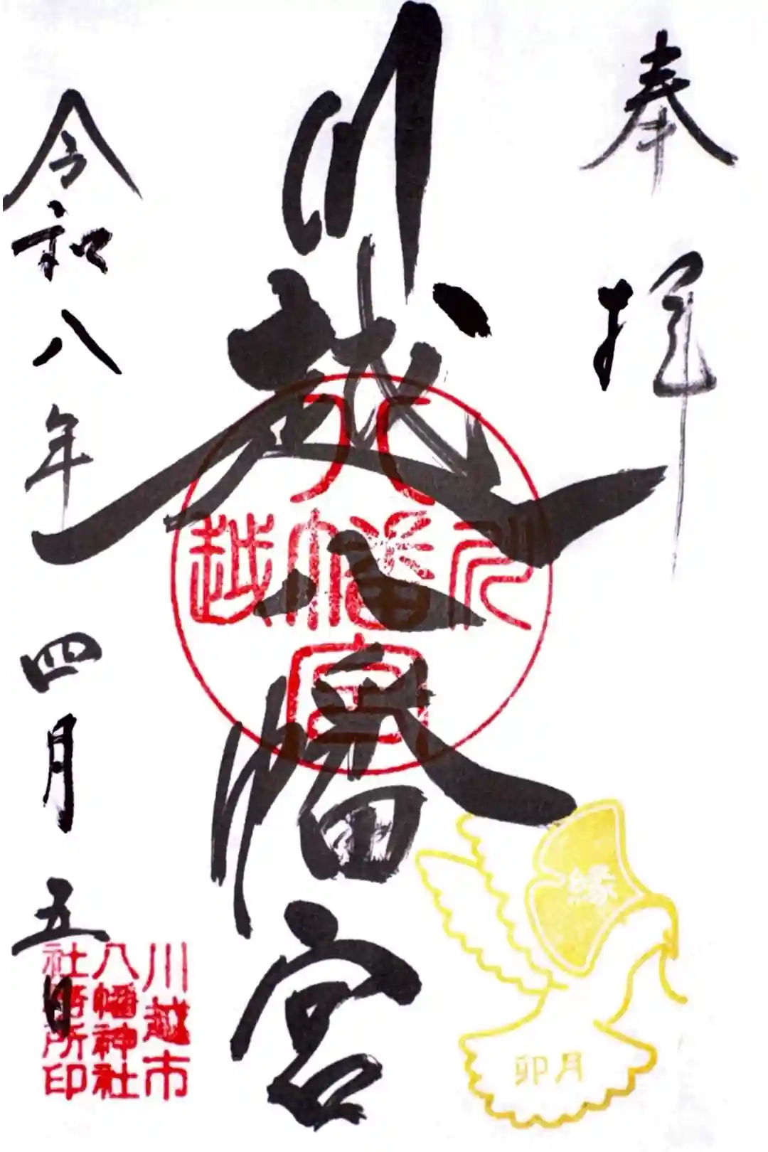 中央に神社印、右上に「奉拝」の文字と鳩の印があり、印の色と鳩の身体の月名、くわえているイチョウの葉の中の文字が毎月変わります。鳩は川越八幡宮の神使で、境内には「縁結びイチョウ」と呼ばれる御神木があります。