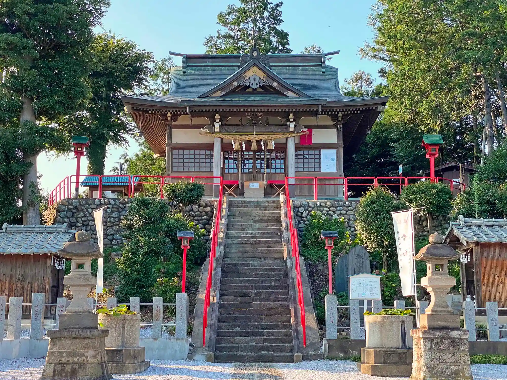 当社は、東武東上線・北坂戸駅の東方3kmの農耕地の端にある。社殿がひと際高い場所にあって、まるでお城の天守閣のようになっている。境内は旧村社として一般的な広さで草木は少な目。古木も見当たらず、その分境内の見通しがいい。
