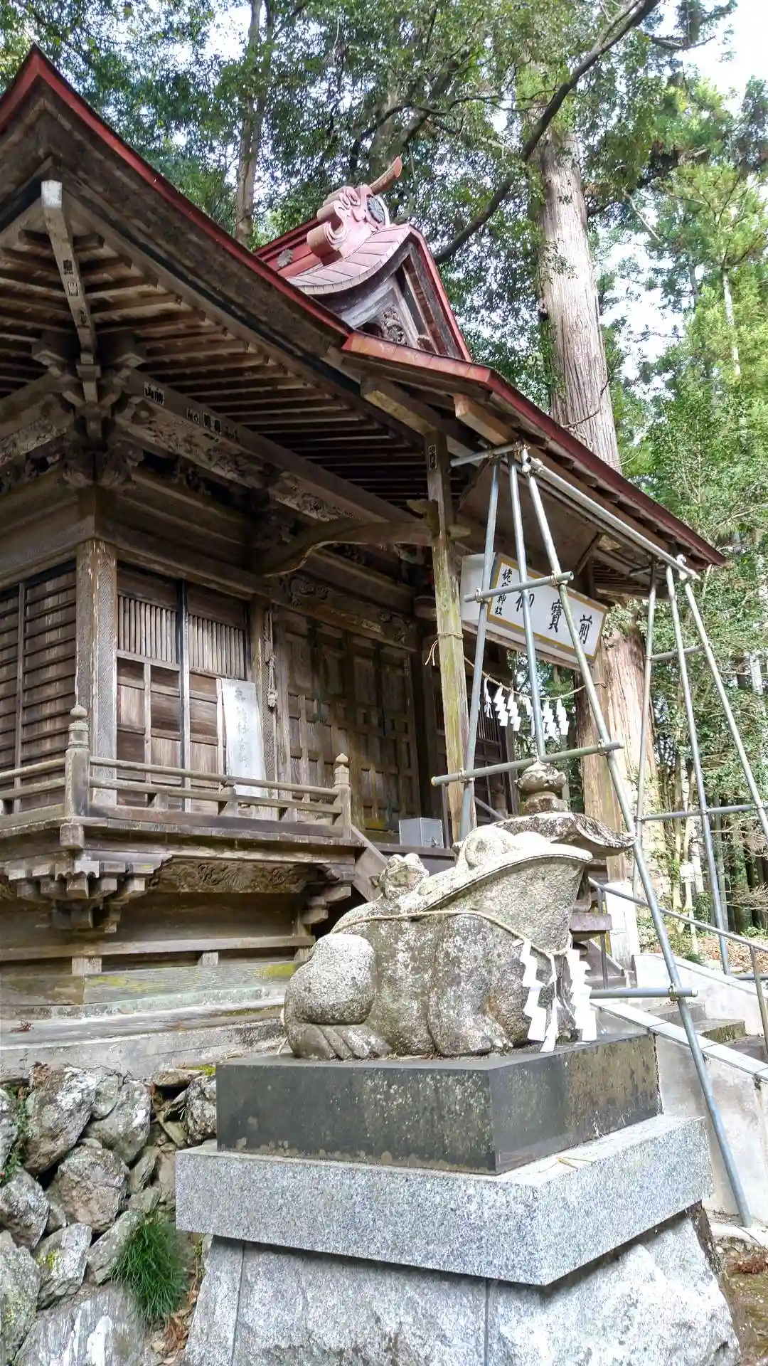 無人社で書置きもありませんでしたが、カエル狛犬の他に、謎の赤い幣束や、ガチな胎内くぐりなどあって、一社目からなかなか楽しめる神社でした。