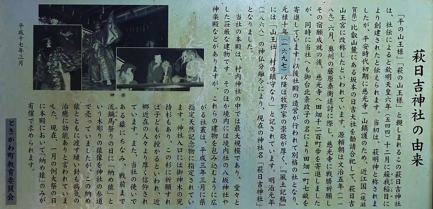 「平の山王様」「萩の山王様」と親しまれるこの萩日吉神社は、社伝によると欽明天皇六年(544)12月に蘇我稲目により創建されたと伝えられます。当初は、萩明神と称されましたが、平安時代初期に慈光寺一山鎮護のため、近江国(現滋賀県)比叡山麓にある坂本の日吉大社を勧請合祀して、萩日吉山王宮に改称したといわれています。
