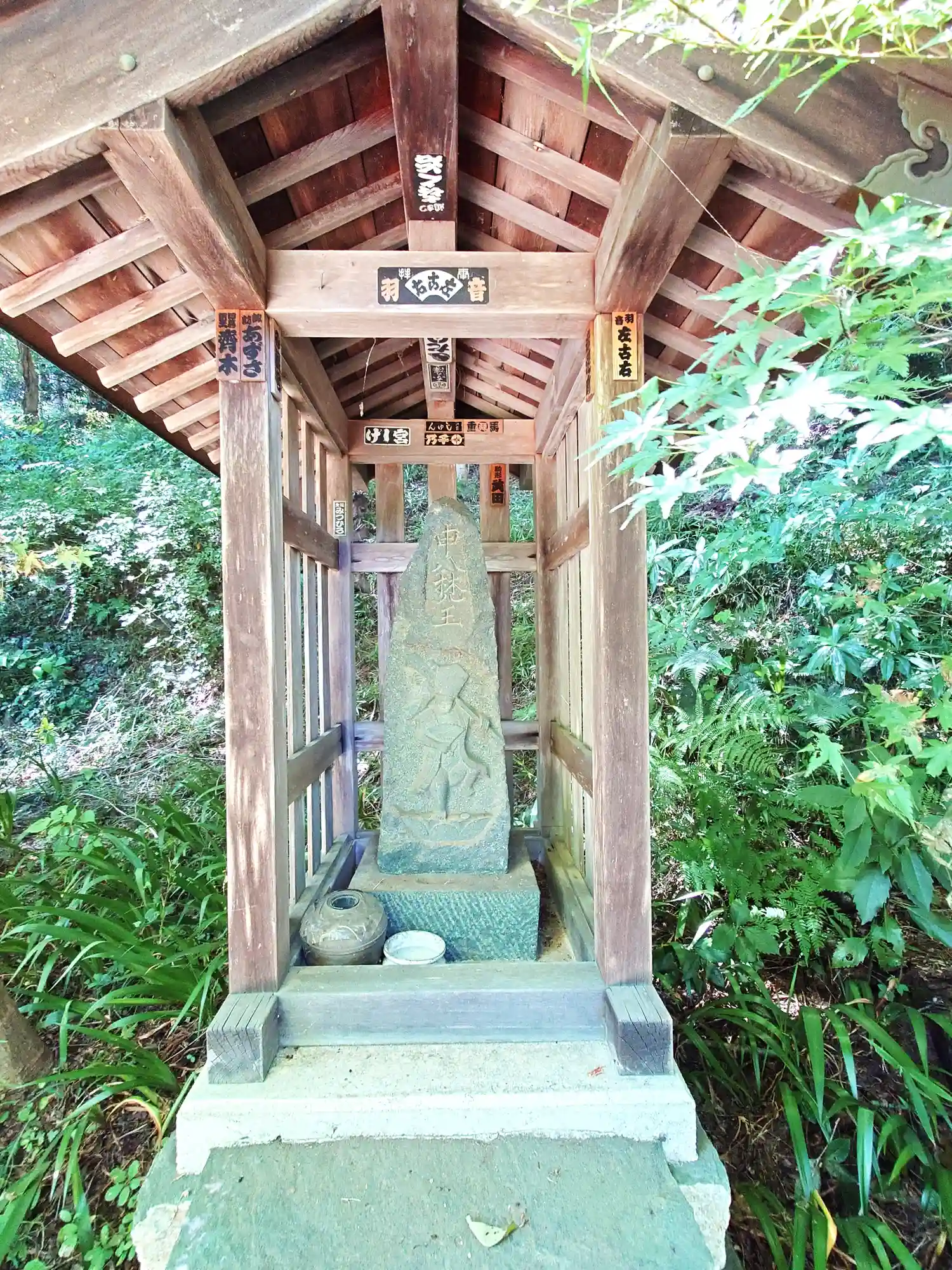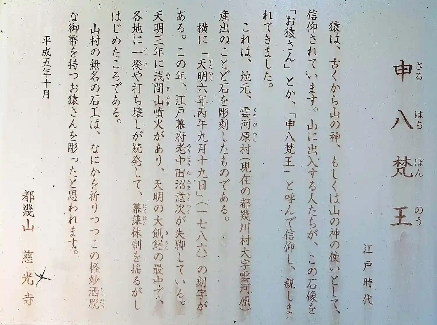 般若心境堂の前に立つ<申八梵王(さるはちぼんのう)>。この猿は、山の神、山の神の使いとして人々から信仰され、親しまれてきたとのこと。横に江戸時代の1786年の刻字がある。