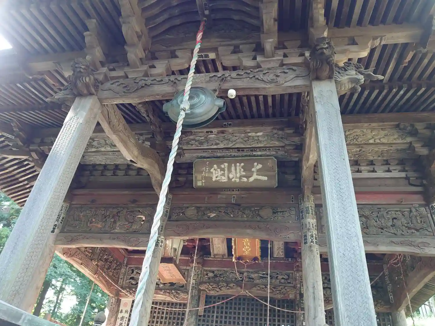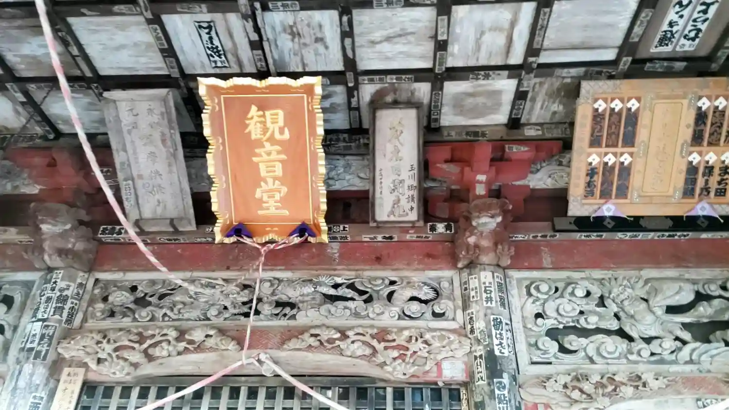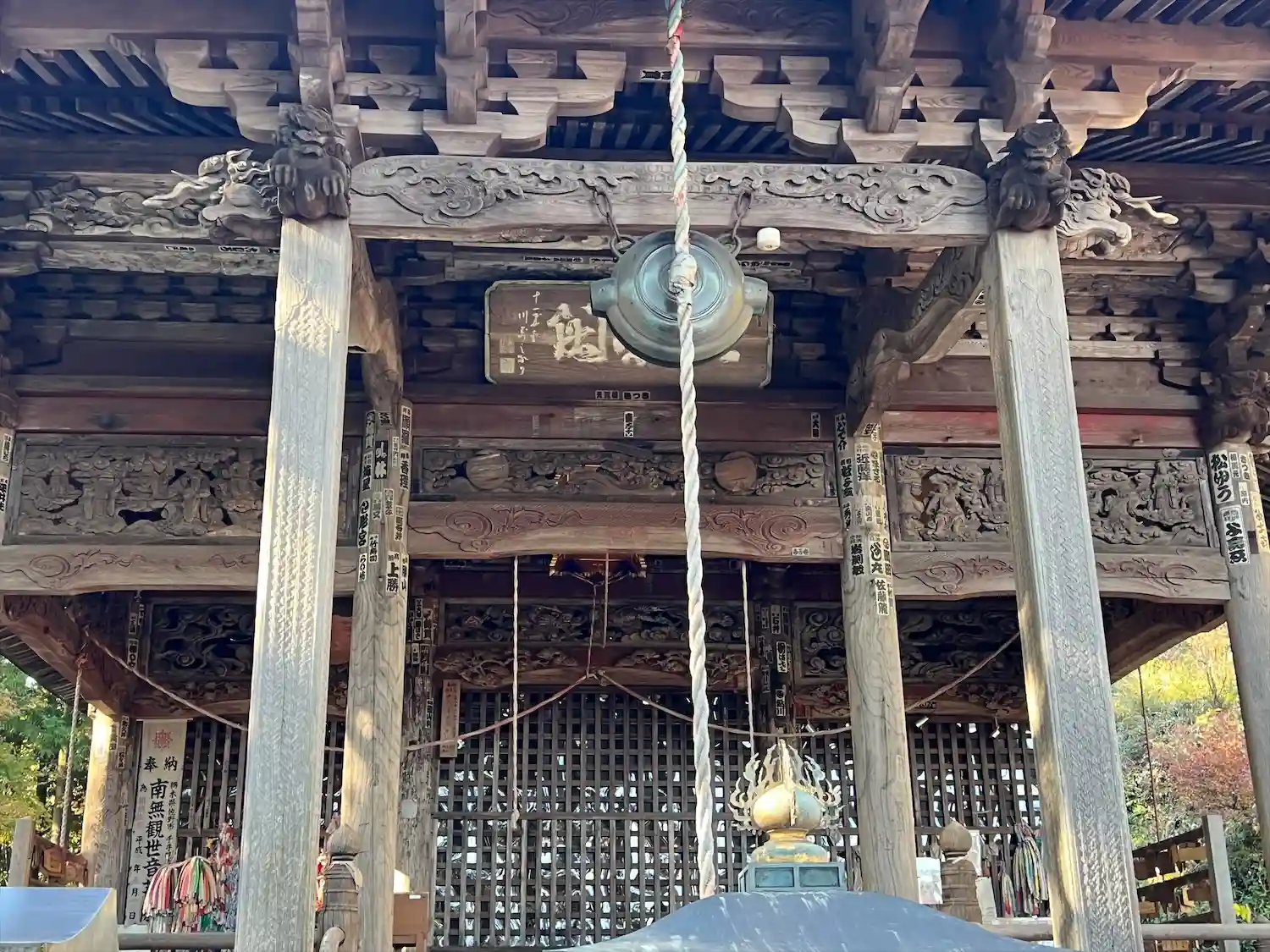 <観音堂>正面。梁、柱、欄間、あらゆる箇所に非常に細やかな彫刻が施されている。<大悲閣>の扁額。