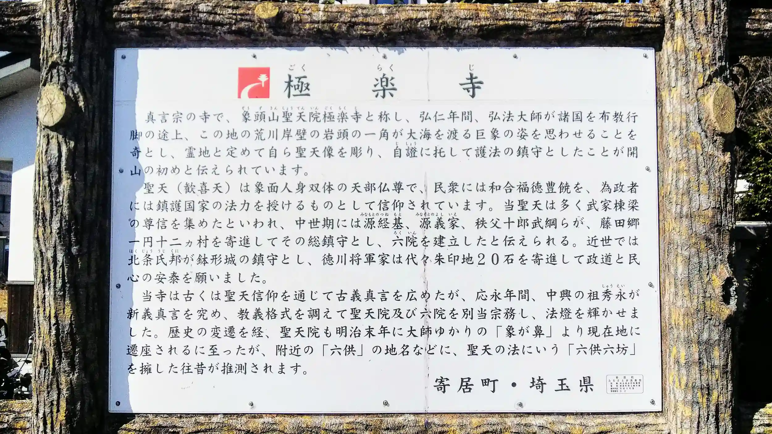 象頭山聖天院極楽寺。真言宗豊山派の寺院です。弘仁年間(810年~824年)の創建と云われています。御本尊は歓喜天です。武州寄居七福神の弁財天と毘沙門天が祀られています。寄居駅から徒歩約20分、境内に駐車スペースもあります。