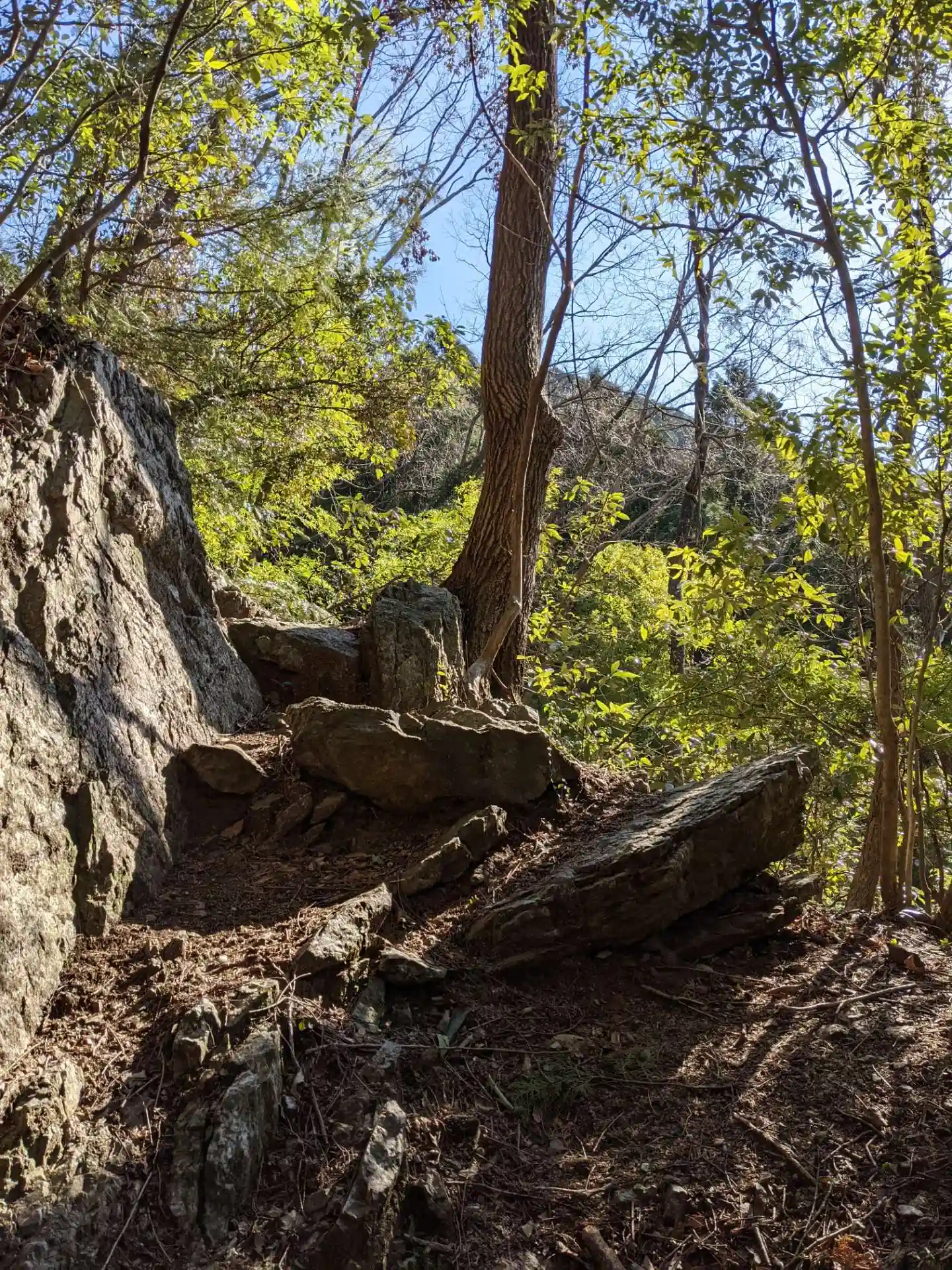 鳥居をくぐって15分程度歩きますがどちらかというと登ります。足元は岩と枯れ葉で滑りやすい上に、道という道はなく狭いスペースを岩を掴みながら這い上がっていきます。