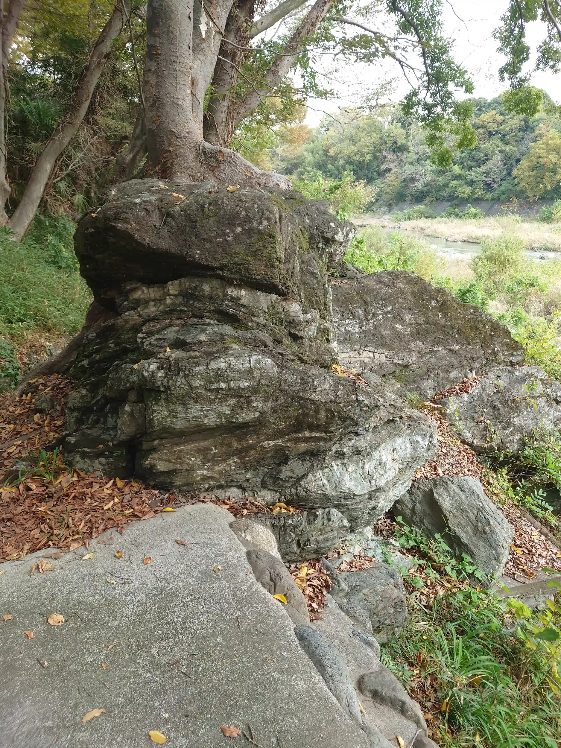 もともとはこの岩の上に祀られていたそうです。岩の横にあるのがご神木。こんな大きな岩を傾けるなんてすごいパワーですね✨