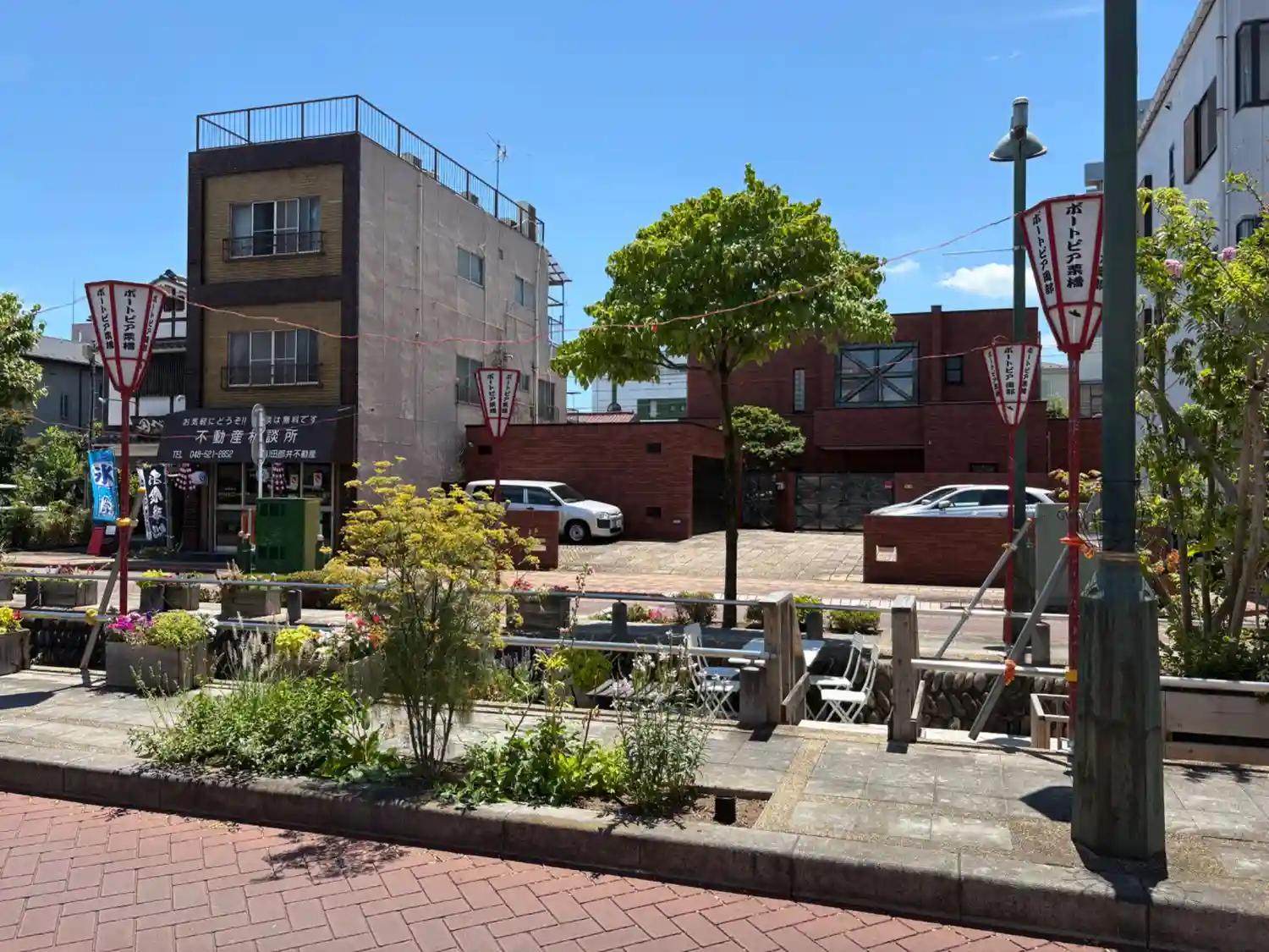 川の上にテラス席とかあって春秋ならお出かけに良さそう。今日は最高気温37度で座ったら熱そう