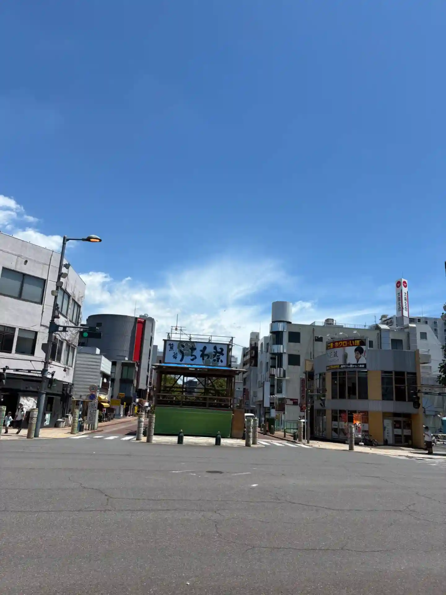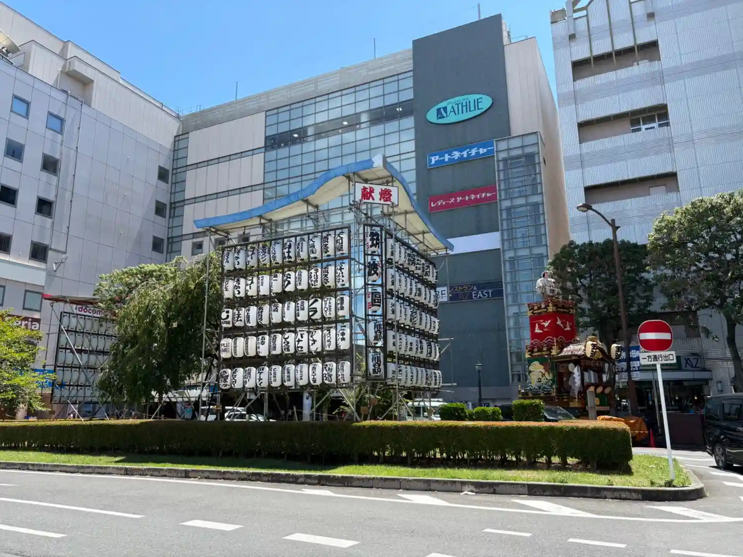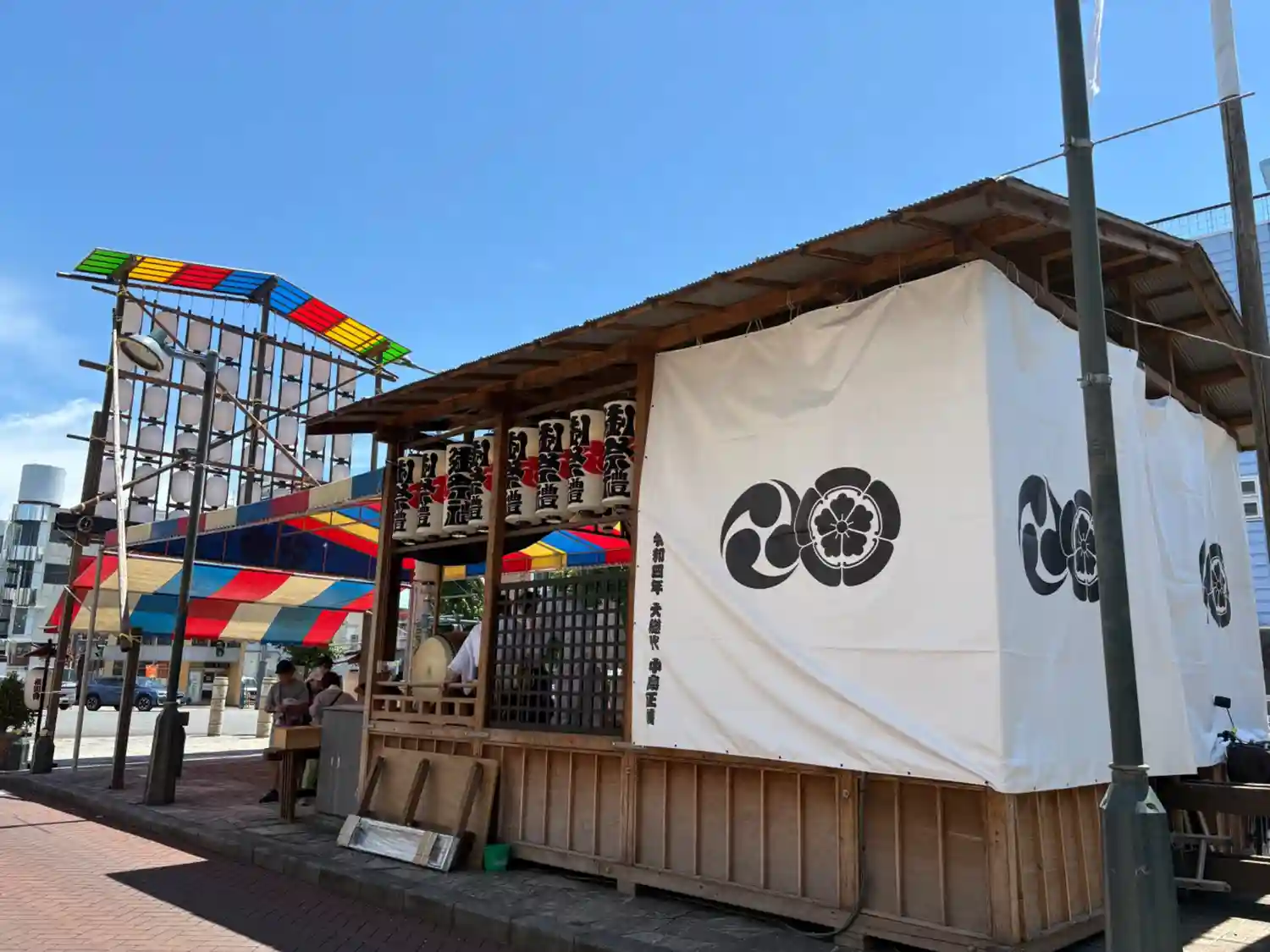 市役所通りの交差点までくると仮設舞台が。神社紋もあるしここのようで。