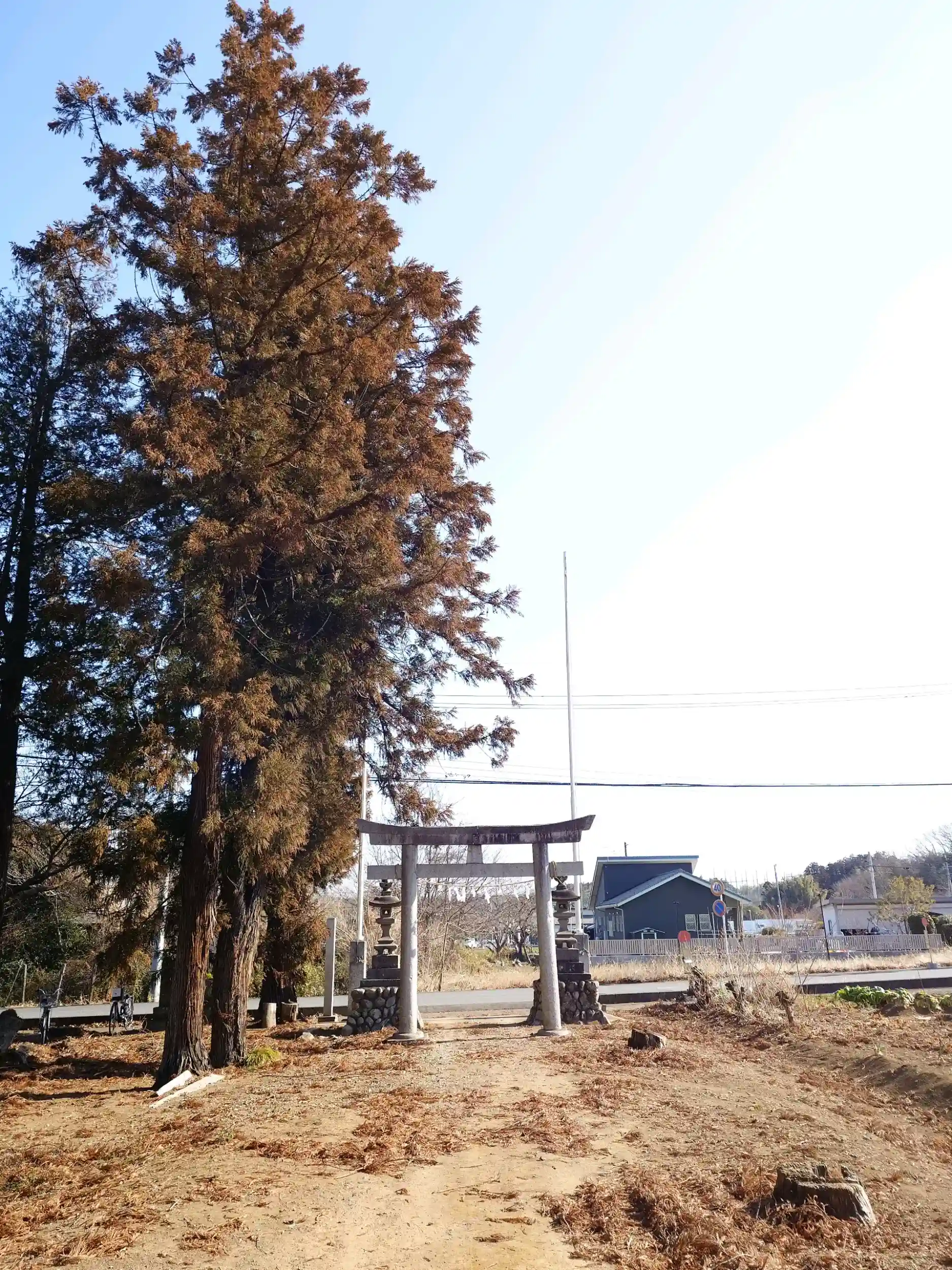 神社の前には国際十王交通「薬王寺」バス停があります。もう少し北に進み和田川を渡ると熊谷市に入ります。