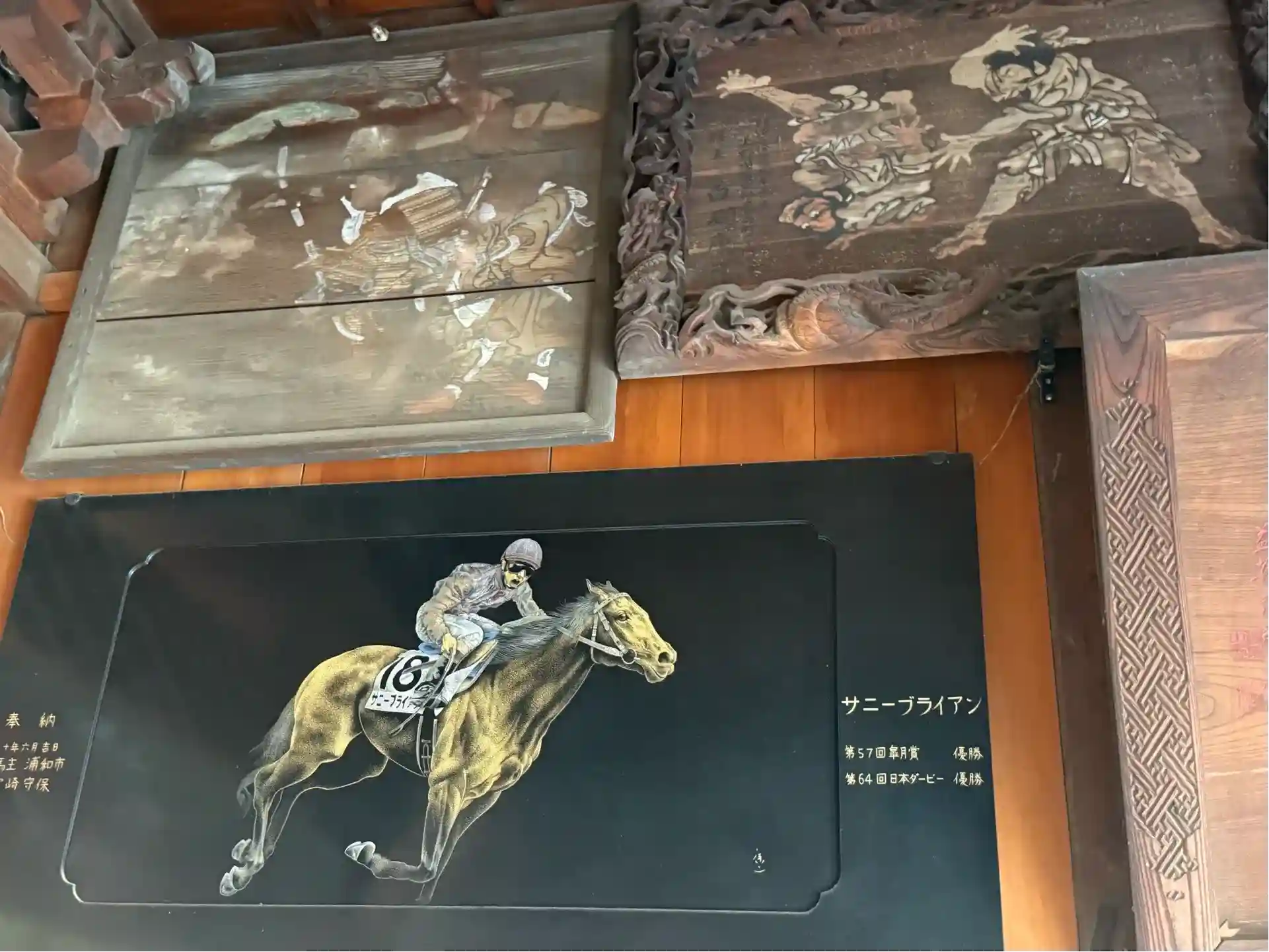 鬼鎮神社のお守りをつけて走った馬がレース勝ったそうで、馬主さんが奉納した漆塗りのお馬さんの絵は300万とか