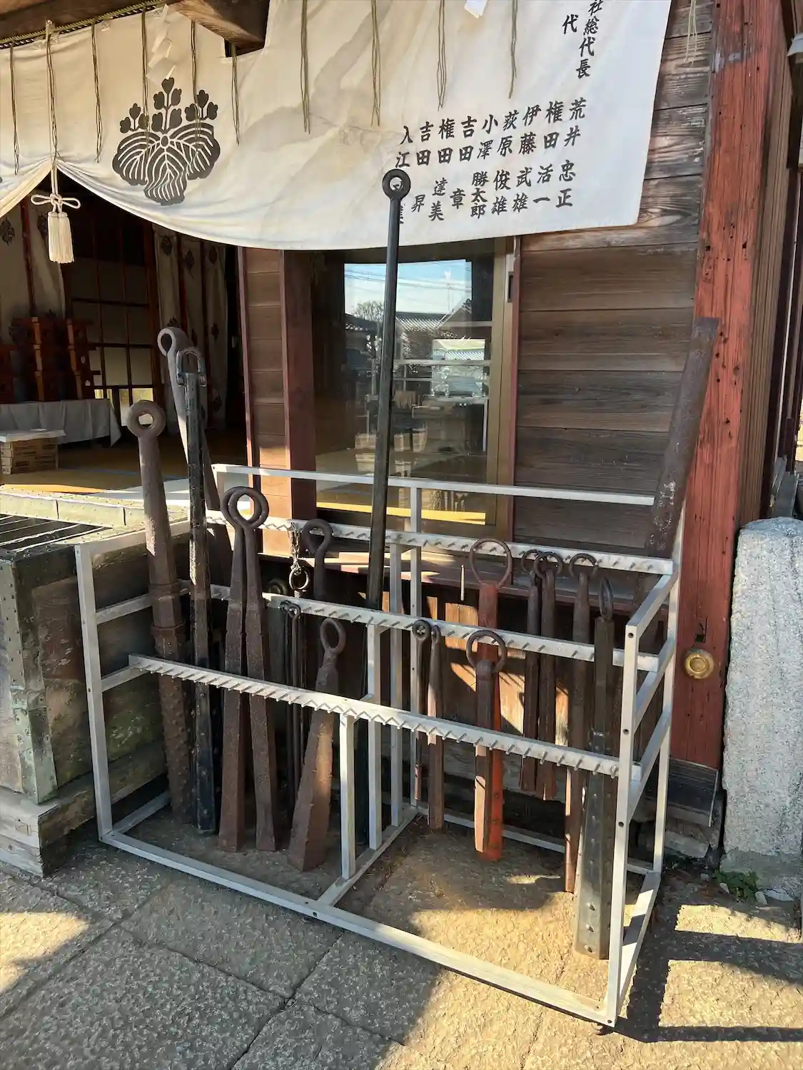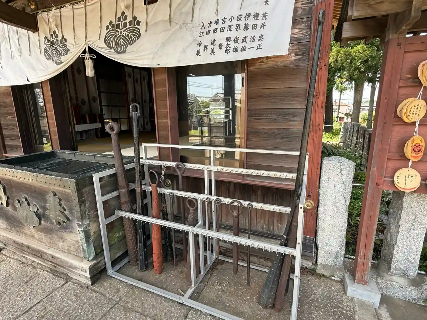 拝殿前の金棒各種。武運長久にご利益があり、それが叶うと金棒を奉納する伝統があるそうです。