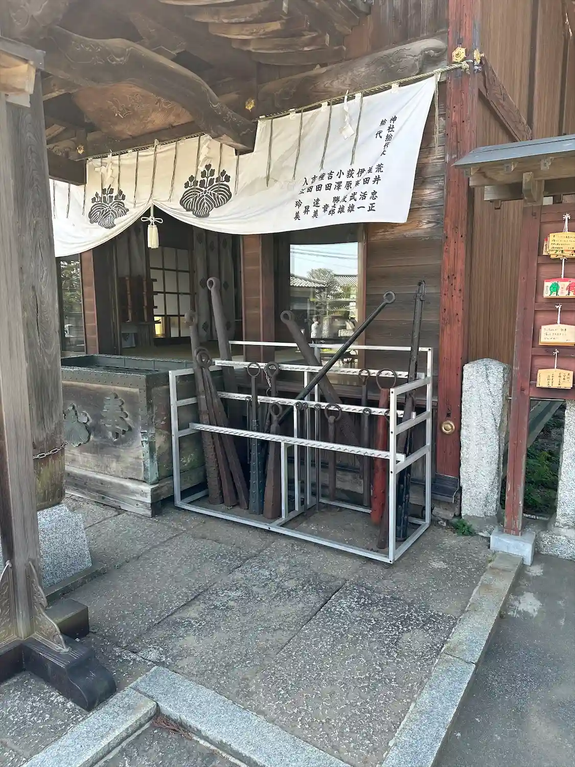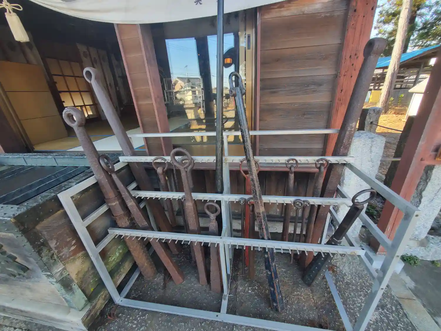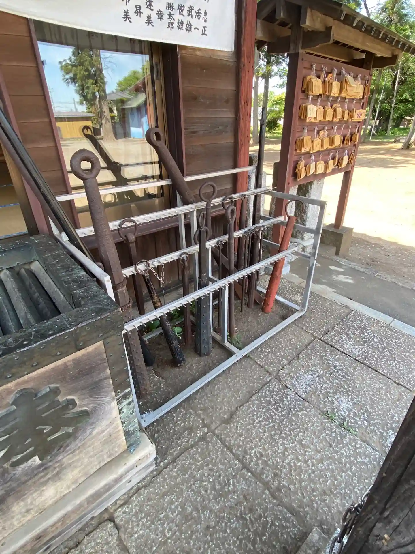 お賽銭箱の隣にたくさんの金棒。