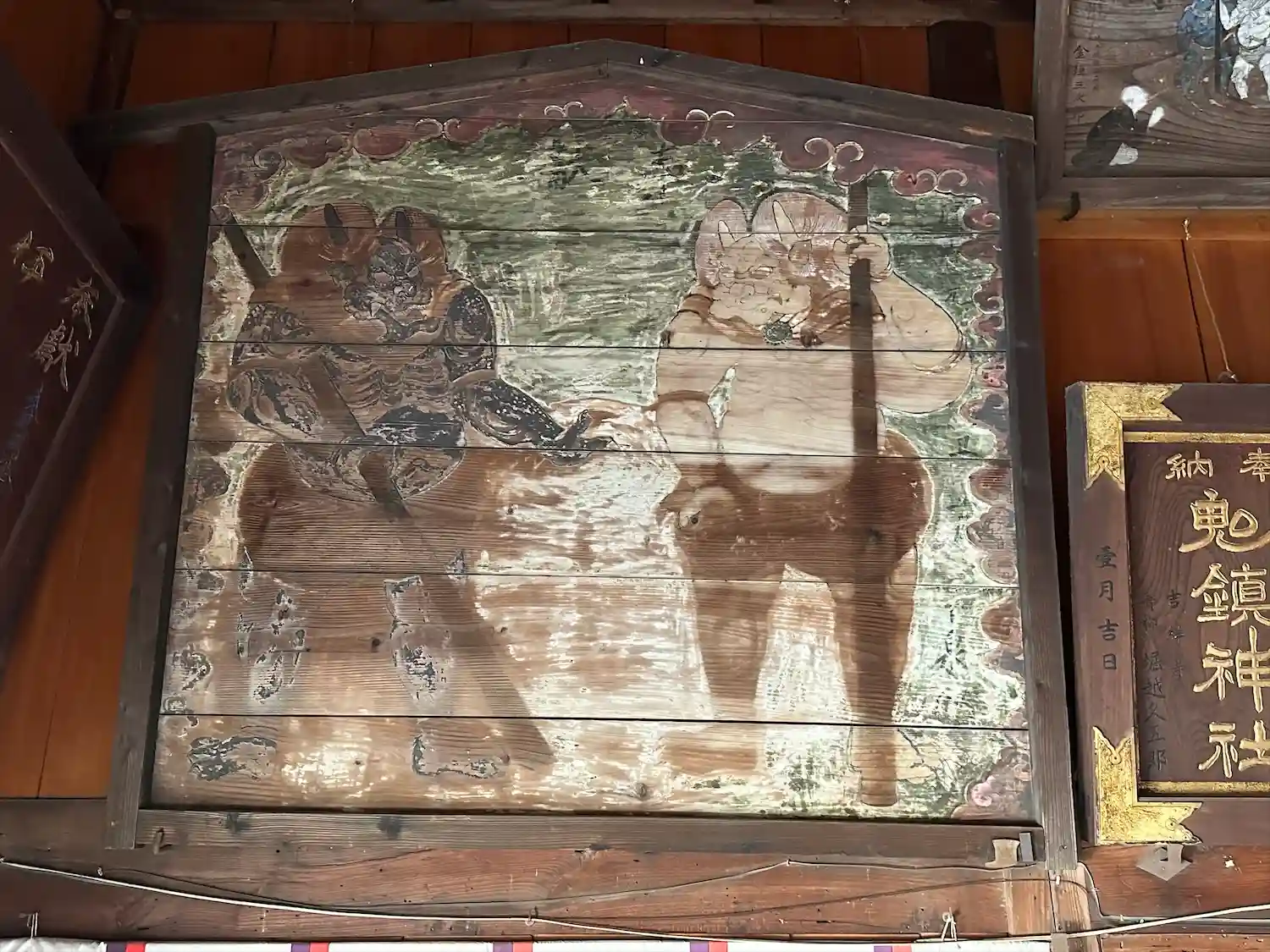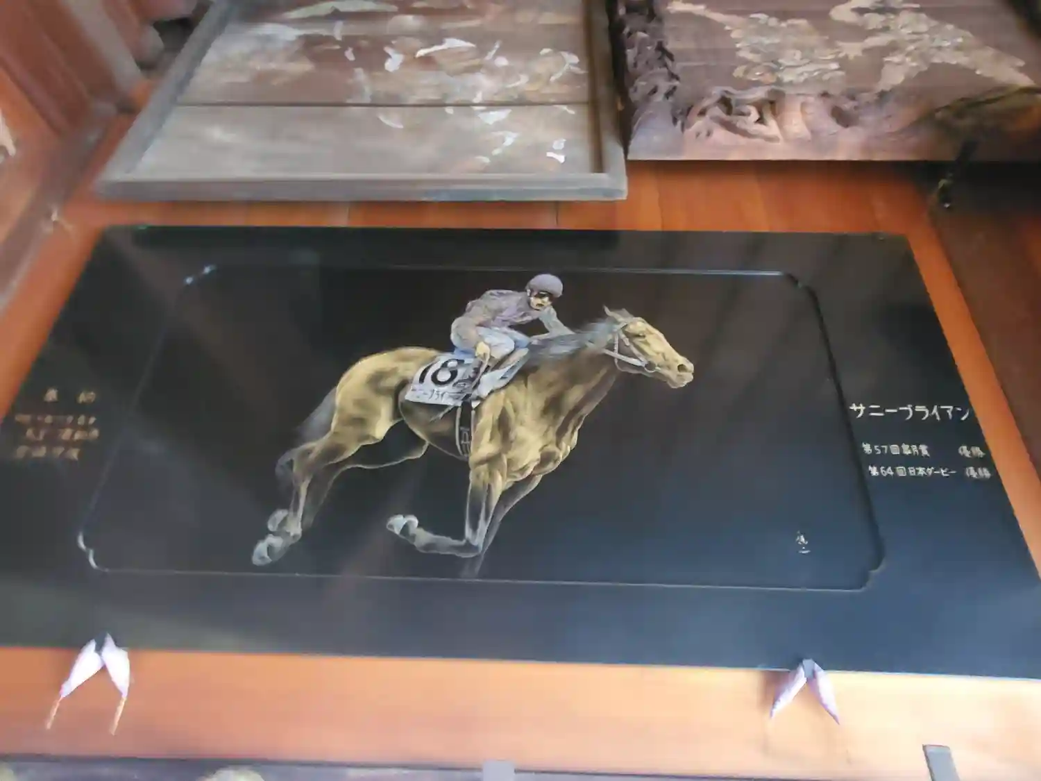 鬼鎮神社のお守りをつけて走った馬がレース勝ったそうで、馬主さんが奉納した漆塗りのお馬さんの絵は300万とか
