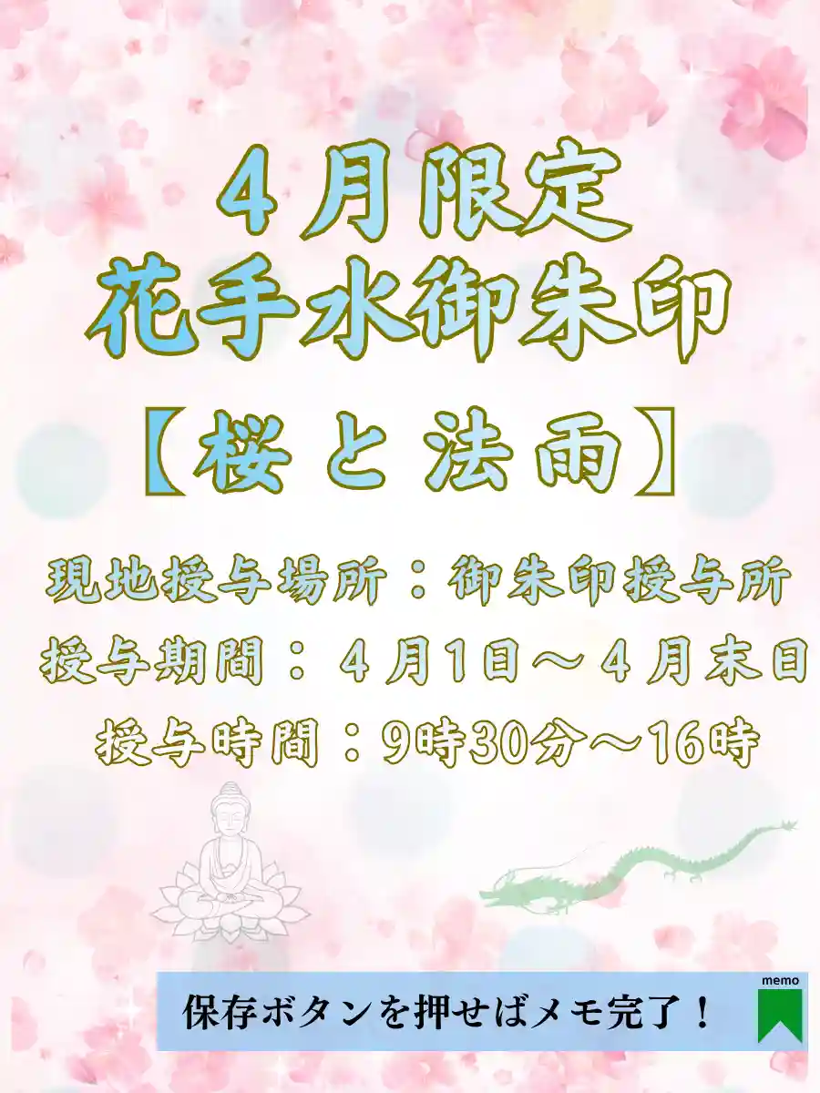 また、当寺は『切り絵御朱印発祥の寺』であり、季節ごとの限定切り絵御朱印をはじめ、透かし御朱印、花手水御朱印など、様々な御朱印の授与を行なっている。
