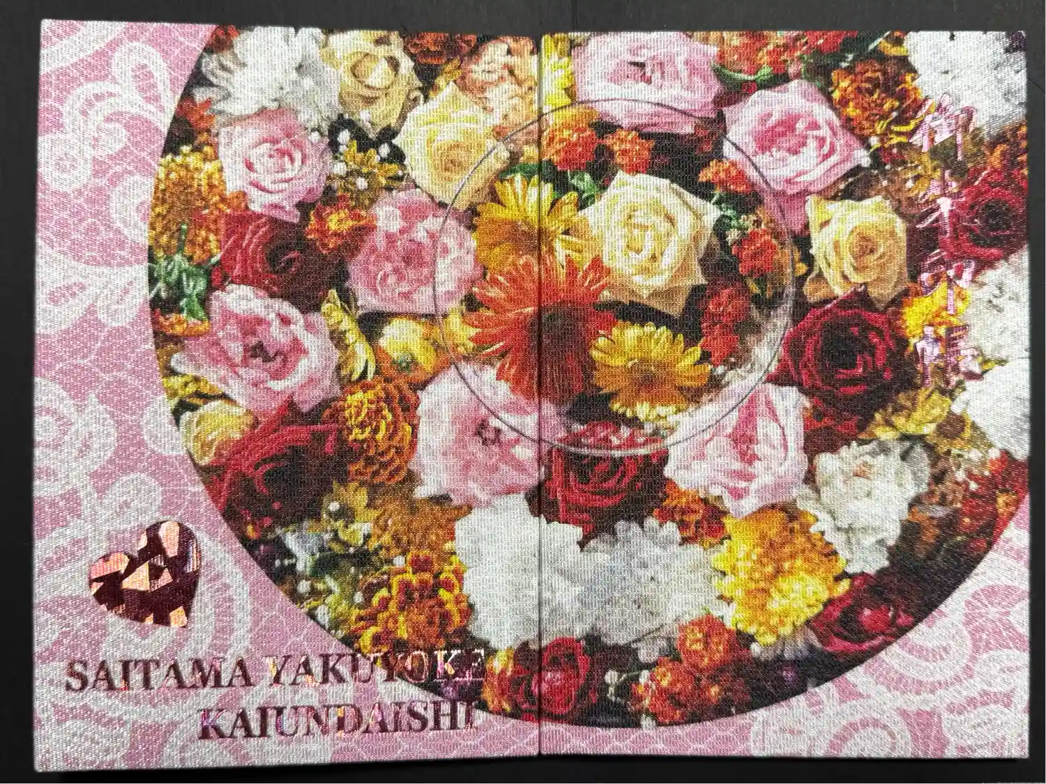 六つの桜と文字の部分は、桜色のホログラムで特別な箔押しをしておりますので、キラキラと綺麗に輝きます。