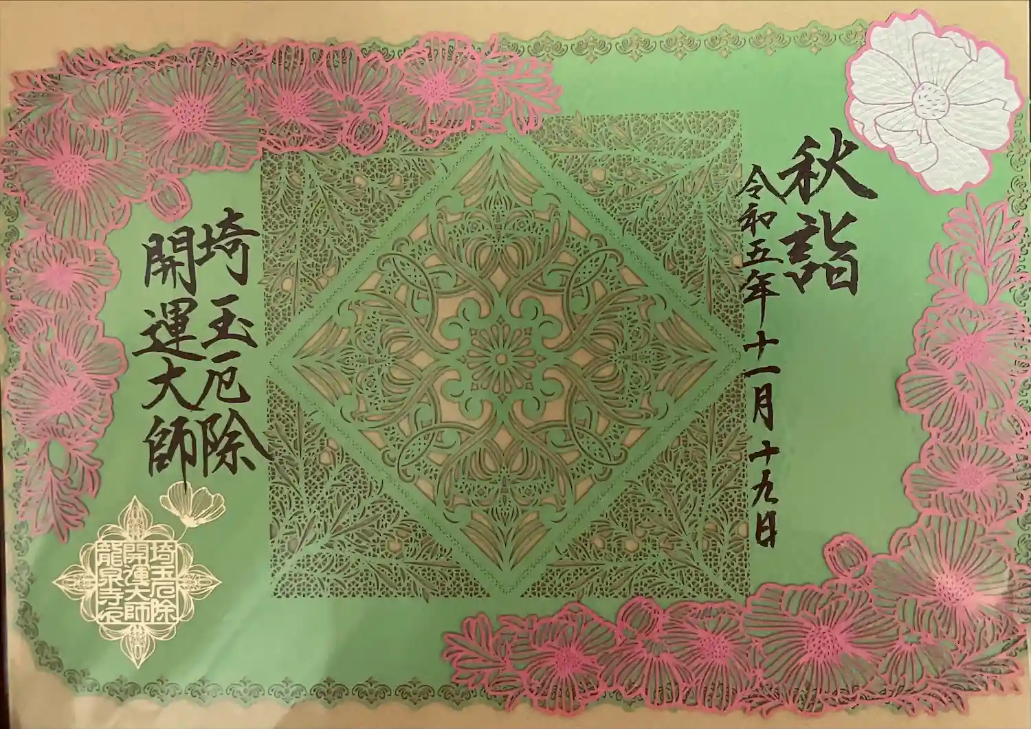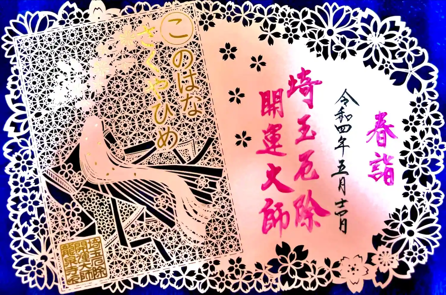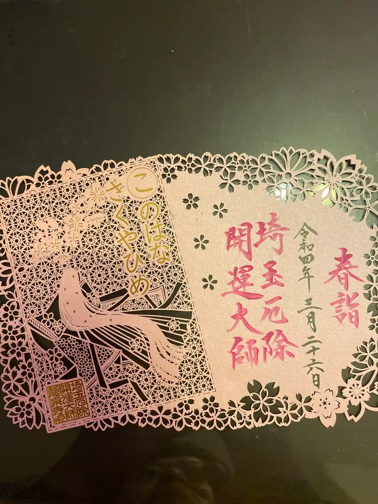 春らしいピンクの切り絵御朱印と、黒の切り絵御朱印そして、法…