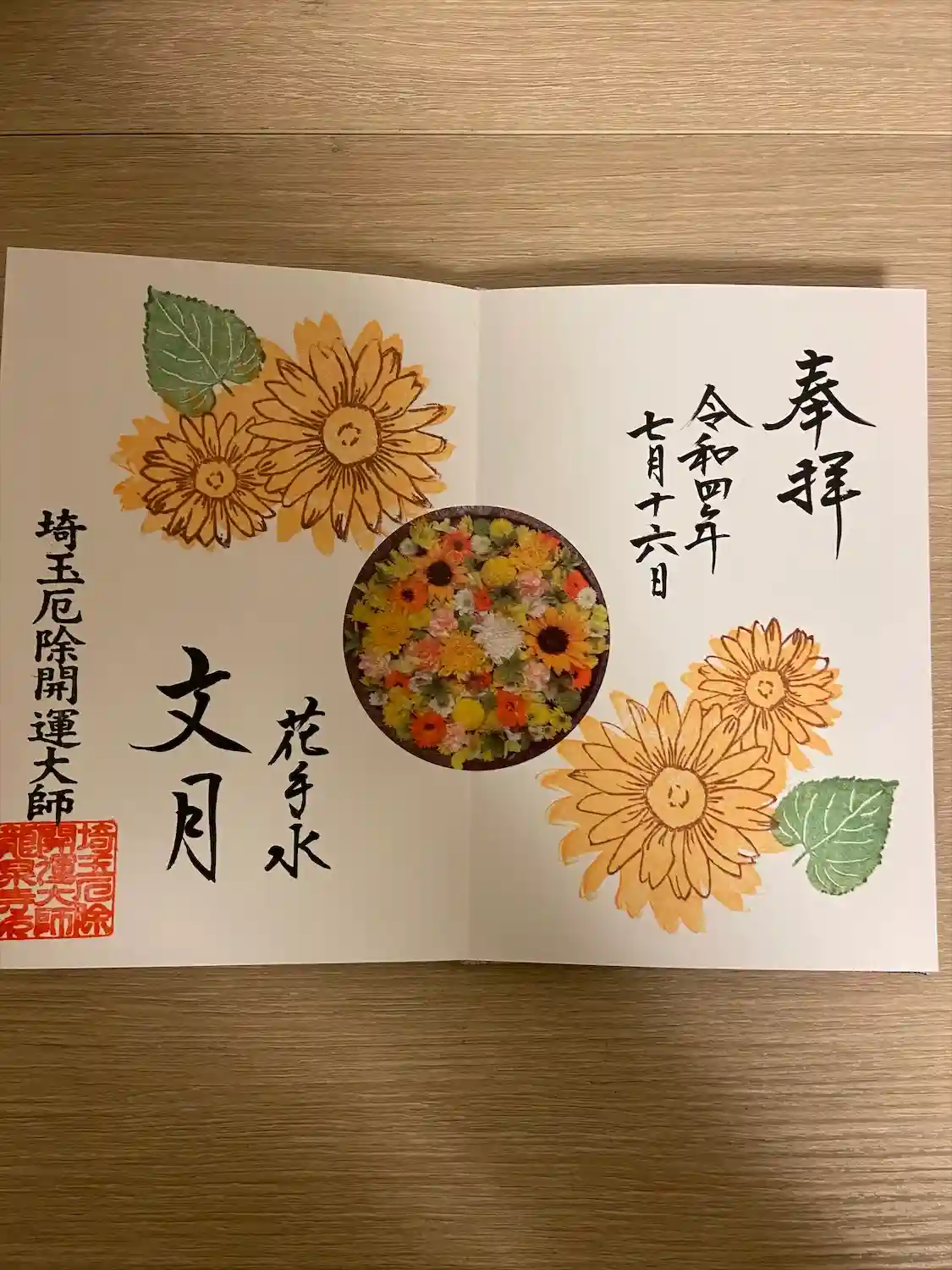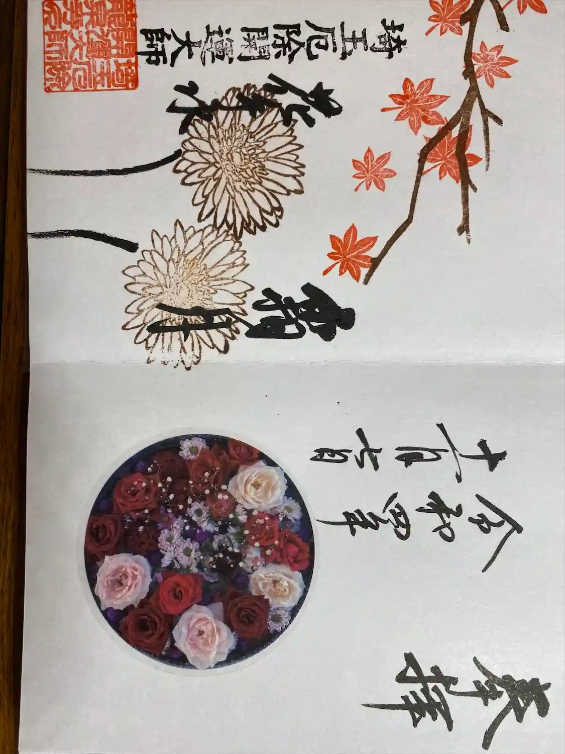 桜舞い散る中、法輪の元で六つの桜が輝いている春らしい御朱印帳とさせていただきました。