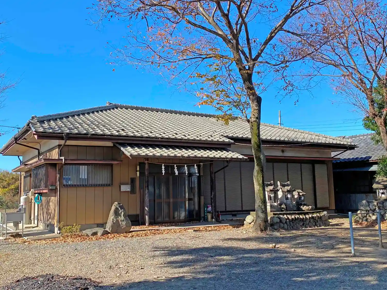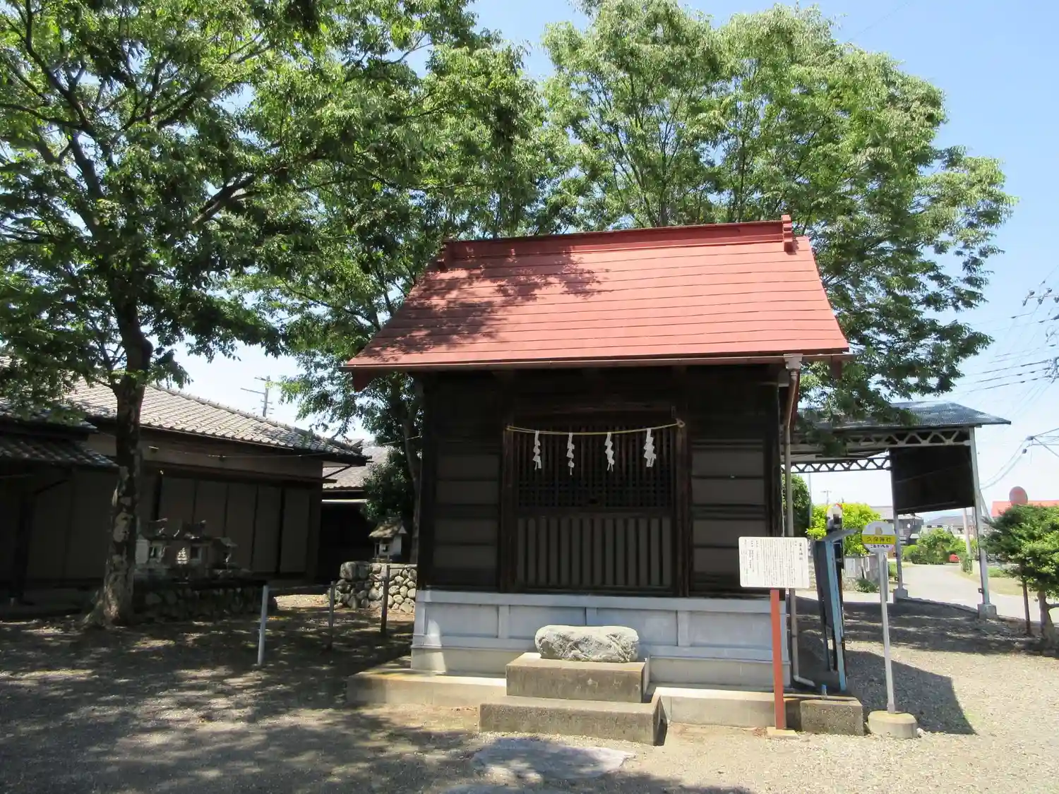 当社は、JR八高線・丹荘駅の北北東2kmちょっとの、田園地帯の中の住宅がゆるく集まったエリアにある。由緒にもある通り、一時期神社ではなかった時期もあるぐらいなので、境内は田舎の家の軒先程度、社殿は拝殿・本殿一体型の小さなもの。