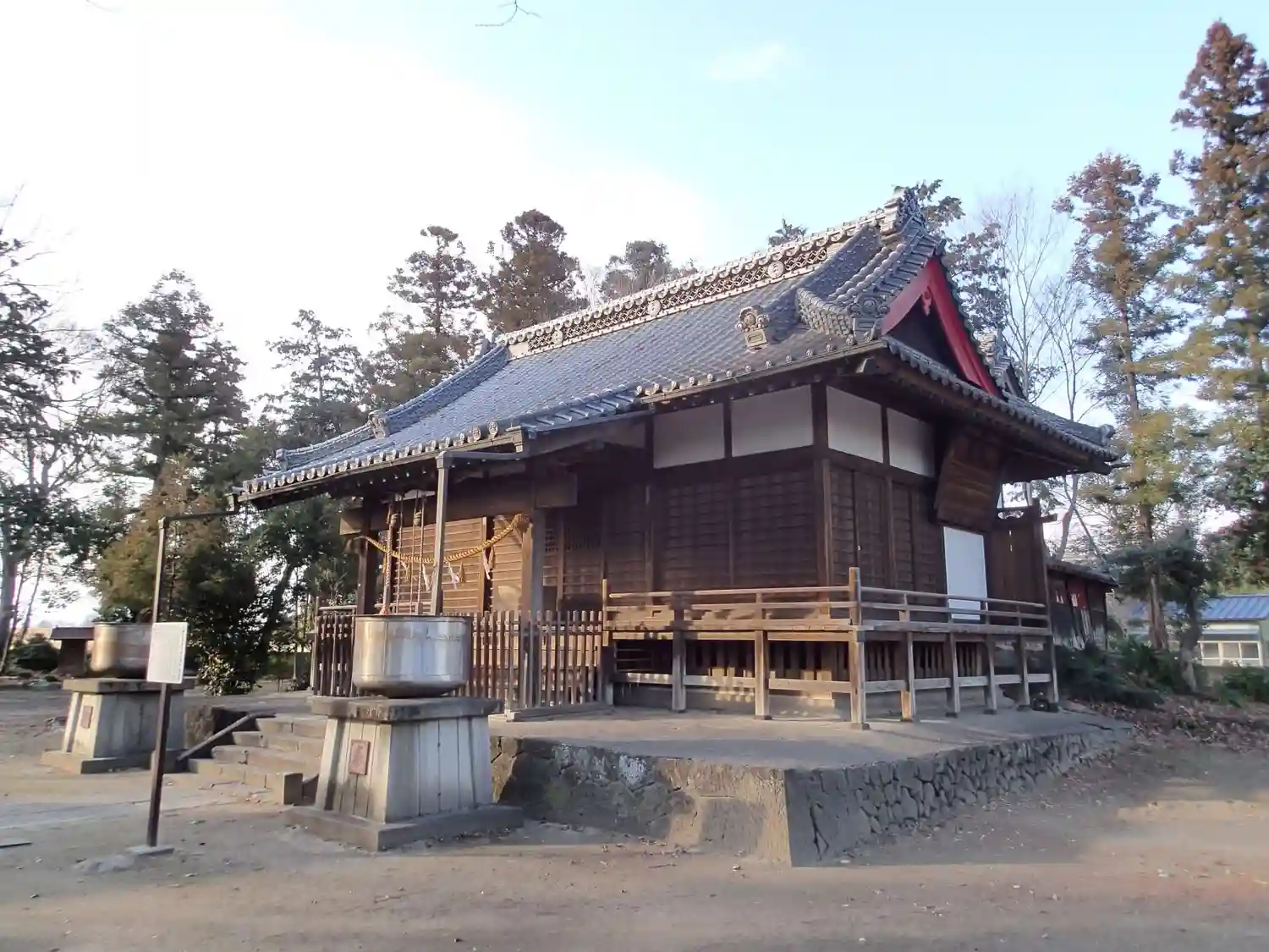 鳥居をくぐると、<拝殿>全景。瓦葺で彫刻や彩色は一切ないオーソドックスなもの。拝殿手前の天水桶は見慣れない金属製。