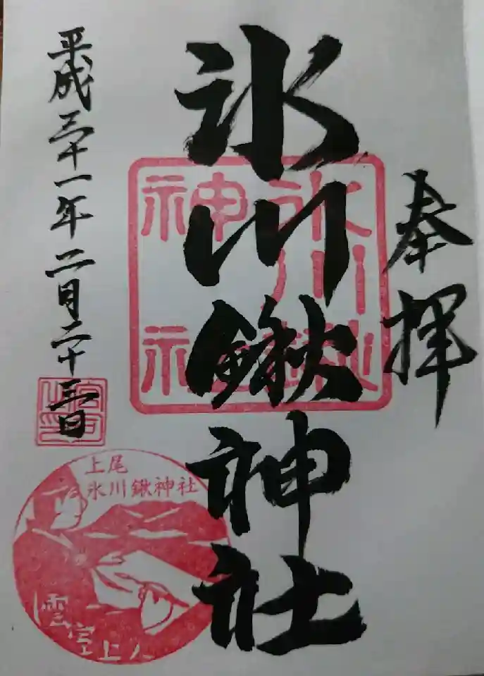 氷川鍬神社は、上尾市宮本にある神社です。氷川鍬神社は、寛永8年(1631)十二月二十五日、桶川宿の方から童子らが櫃を上尾宿に引いて来て歌い踊り、更に江戸まで送ったものの、年末には当宿に戻り、正月になって櫃を開けると、中に違い形に結び付けてある小鍬二挺が納めてあったことから、これを鍬太神宮として祀り、上尾宿総鎮守としたといいます。明治41年、二ツ宮氷川神社の女体社と、上尾宿字南本村の八幡社・字浅間の浅間社を合祀、氷川鍬神社と改称、村社に列格したといいます。